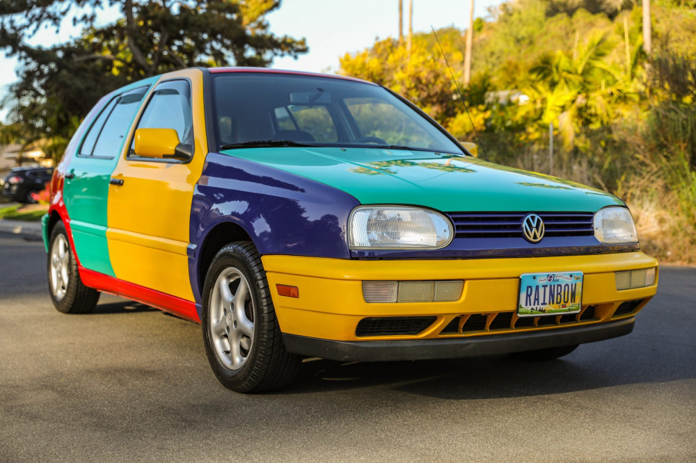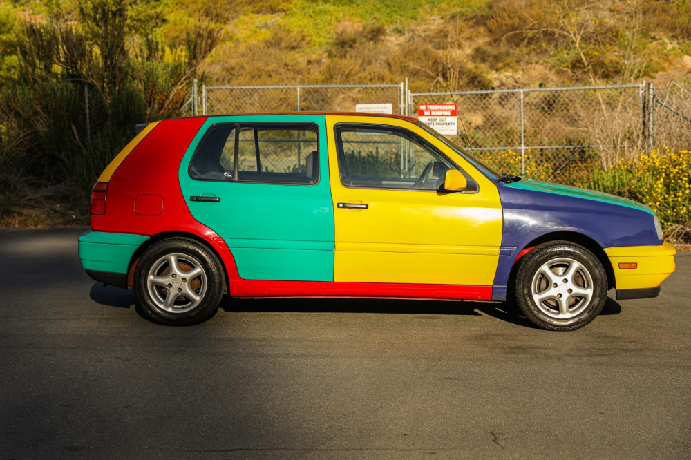 This Volkswagen Golf Harlequin from 1996 is one of 264 multi-color models built for the North American market. Tornado Red serves as the car's base coat, with body panels in Ginster Yellow, Chagall Blue, and Pistachio Green.