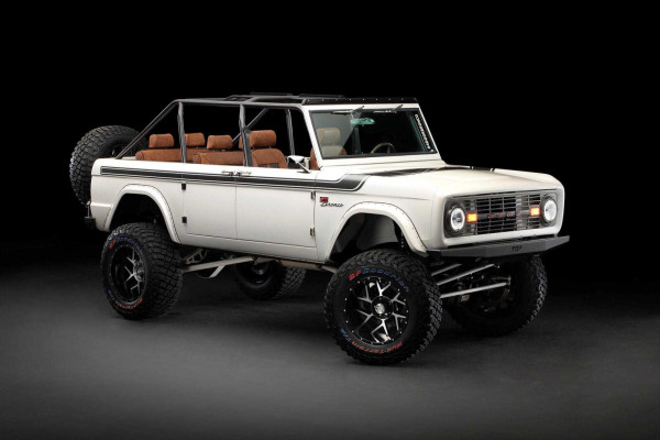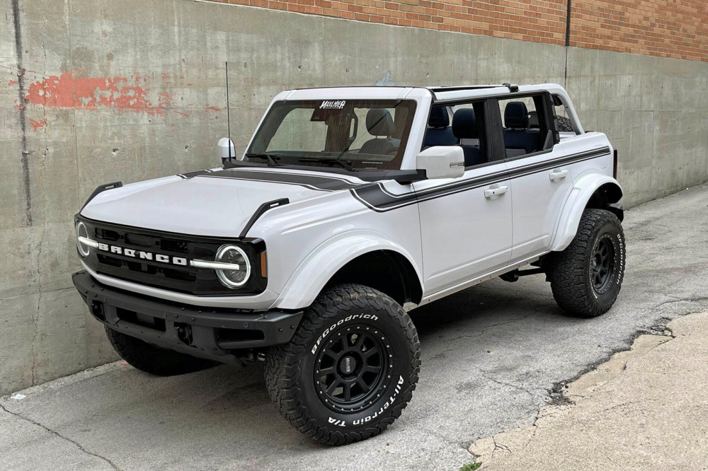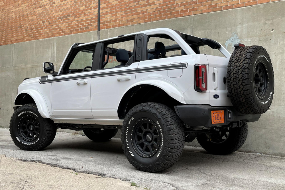 This old-school homage to Ford's 2019 SEMA Top 12 Bronco is based on a new four-door Bronco. It yells daring with the top off and 18-inch wheels offset -12. The 35-inch BFGoodrich KO2 tires are finished in Phantom Black on the driver's side and Ghost Grey on the passenger side.