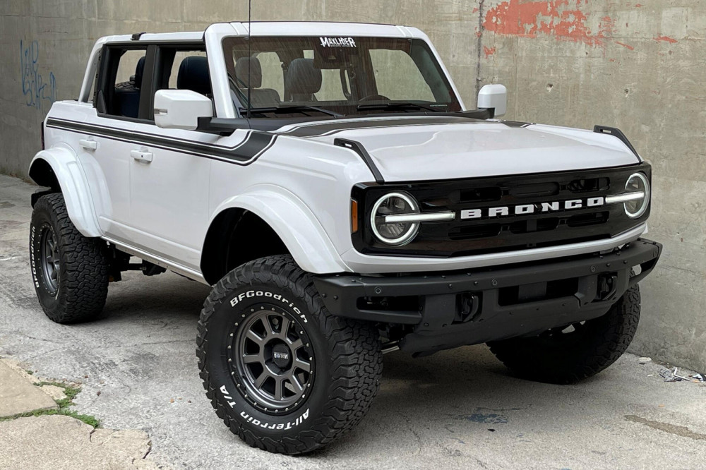 Matte black striping runs up the sides and across the bonnet, adding another elegant finish. Owing to a BDS suspension Sasquatch package, this Bronco also gets color-matched Maxlider MX4 fender flares, which fit the 4-inch lift.