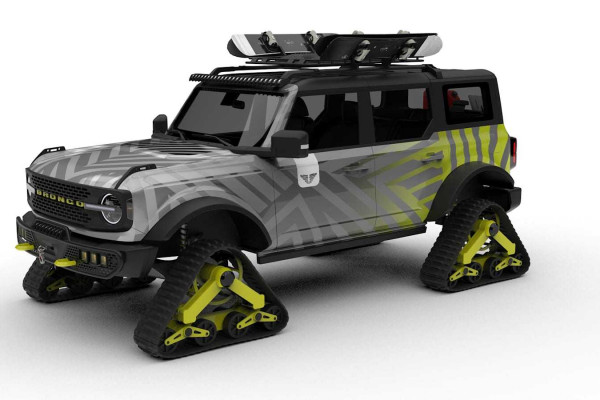 Tucci Hot Rods' 2021 Bronco: The four wheels and tires have been swapped out for a quad-track layout, so this is your Bronco for snowy trips. This Bronco began life as a four-door Badlands with a four-cylinder engine and a seven-speed manual transmission. It now has Mattracks 88-Series quad tracks as well as a plethora of other attachments. A Rigid light bar, Radiance light pods, a Warn winch, extendable running boards, a snowboard rack, and a Yakima platform roof rack system are among the features.