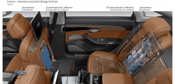 The relaxation seat in the A8 L with multiple settings, electronically controlled comfort headrests, back massage with 18 pneumatic cushions, and a footrest on the rear of the passenger seat with heating and massage functions are just a few of the choices available for the back seats. Valetta leather is the basic upholstery, with Valcona leather available as an upgrade. There's also a bar area between the back seats, as well as four-zone luxury automated air-con, ionizer, and fragrancing.