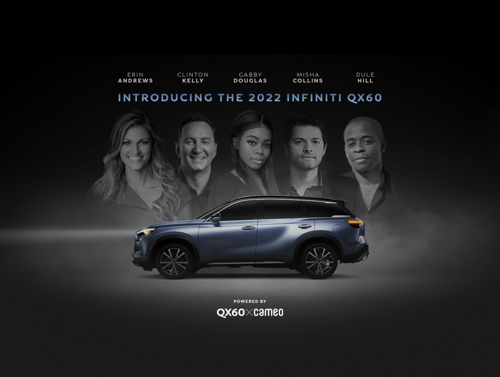 Following that, Infiniti will collaborate with video-sharing service Cameo to have celebrities answer questions about the new QX60, with individualized responses. Erin Andrews, Clinton Kelly, Gabby Douglas, Misha Collins, and Dule Hill make up the celeb panel.