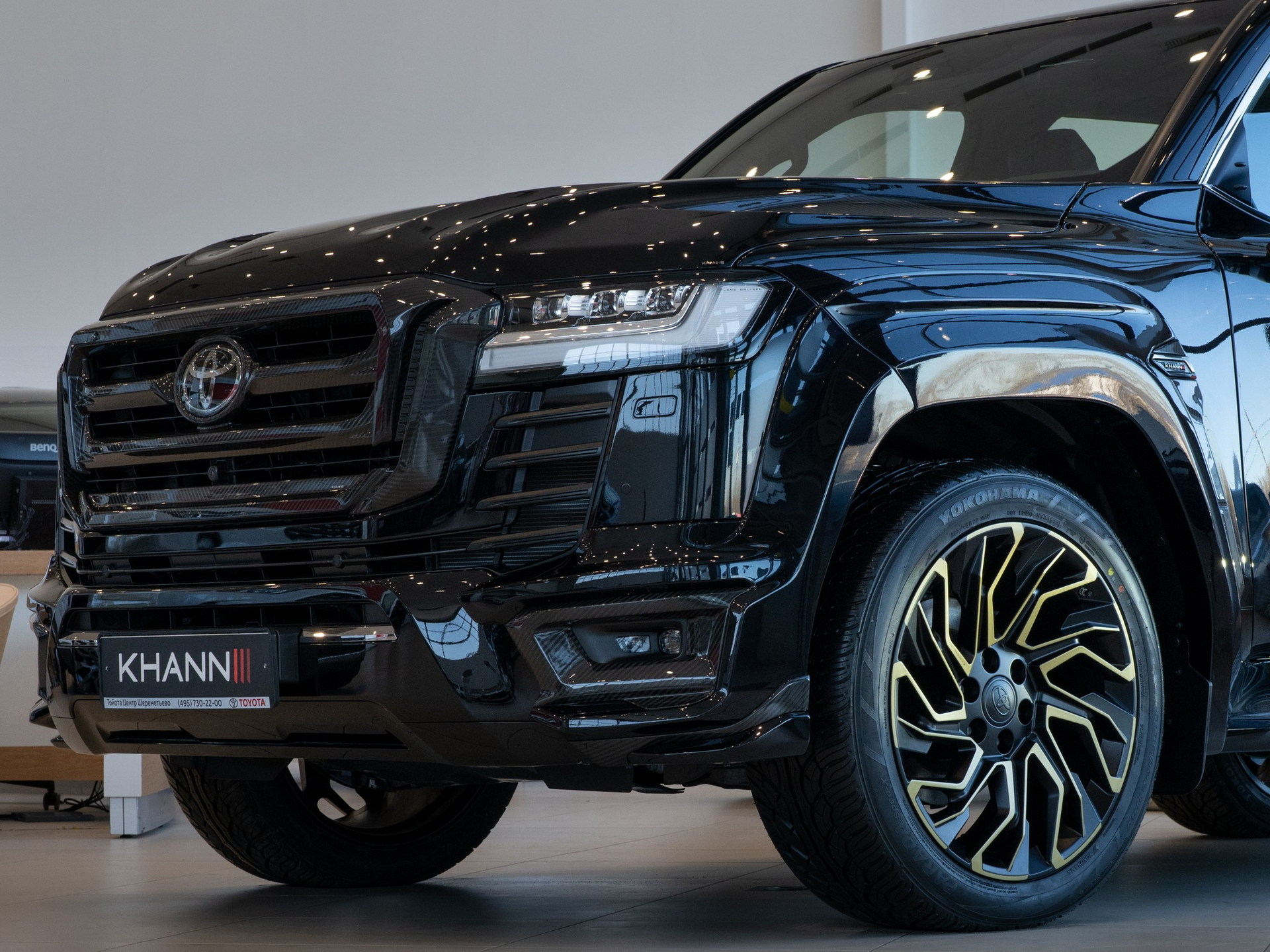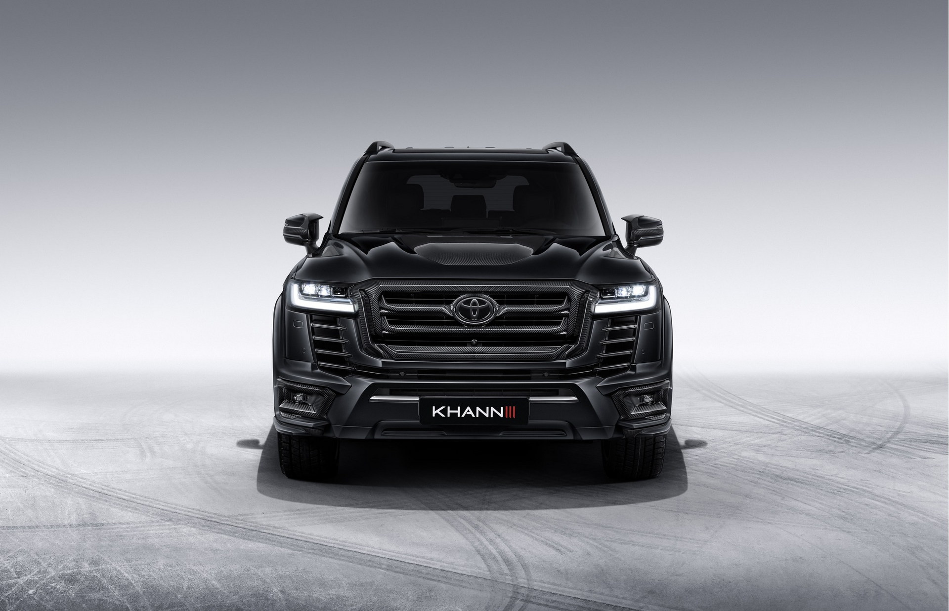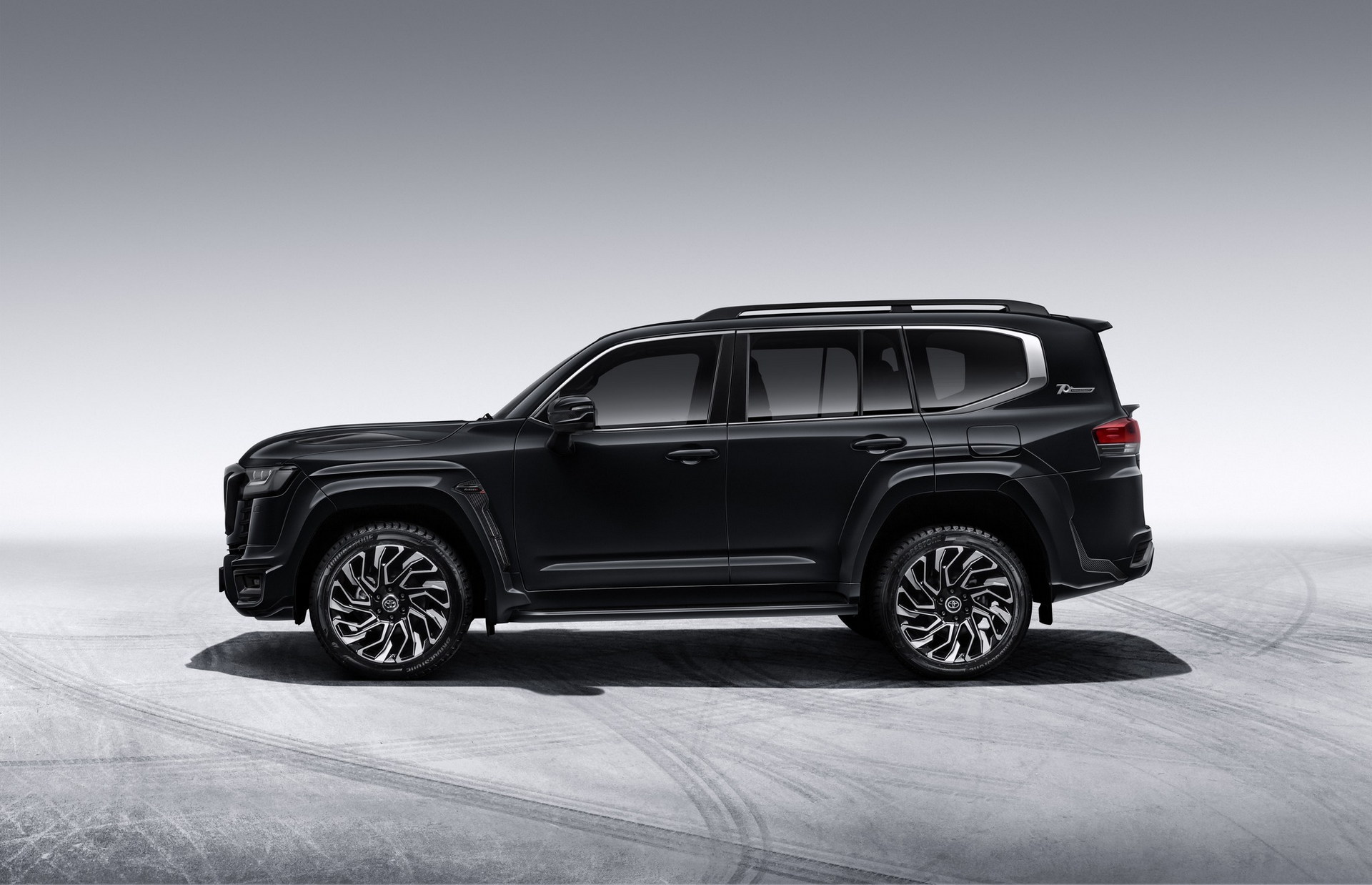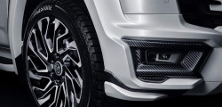 The Land Cruiser receives a new carbon fiber grille, intake finishers, and ventilated bonnet, as well as a front bumper extension with fake intakes and LEDs.