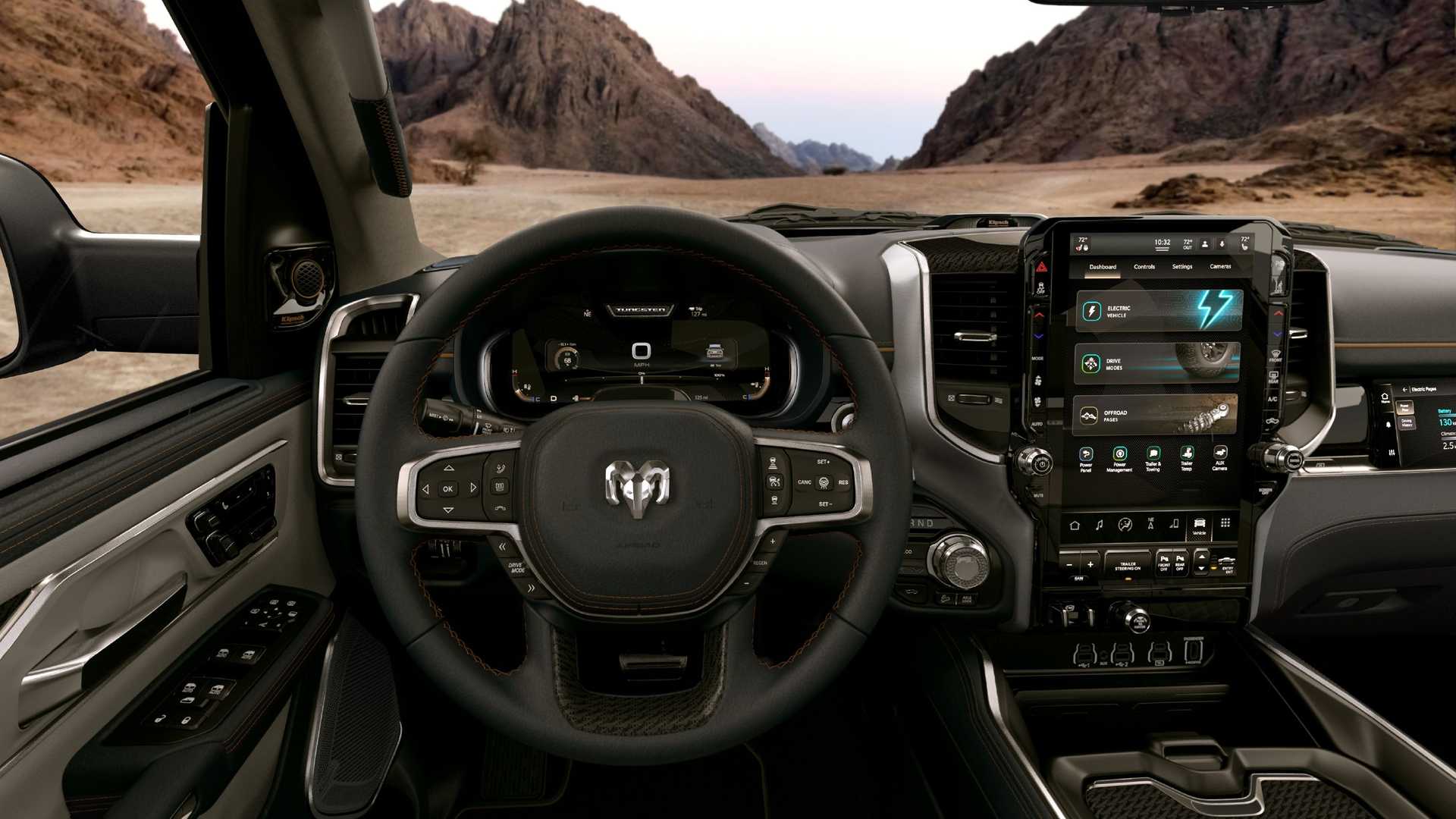 Also good news is that the new 2025 Ram 1500 is available in five distinct trim levels, each with its own set of perks: the Tradesman, Big Horn/Lone Star, Laramie, Limited, and Tungsten. The top-tier Tungsten model comes with features including a 23-speaker Klipsch sound system, a motorized tailgate, a suede headliner, and metallic cabin accents. In addition, a hands-free driving assistance system will be offered as an extra.
