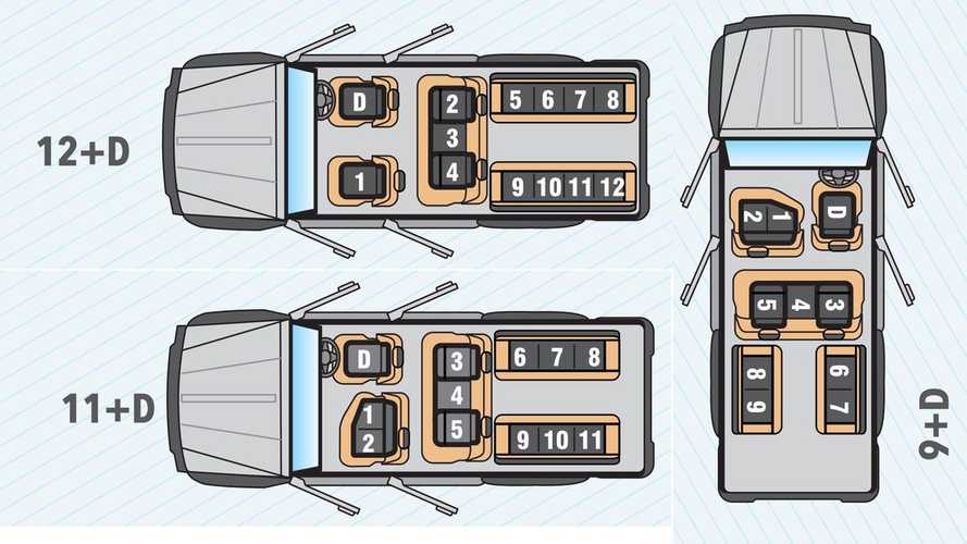 The 13- seat version is even stranger with arrangements for two people on the front, three in the middle, four people against each wall in the back, but no luggage space. The exterior shows a rear hatch door large enough for easier access to the benches in the back. The automaker thought of a deployable step. You can create luggage space by folding upward for more room.