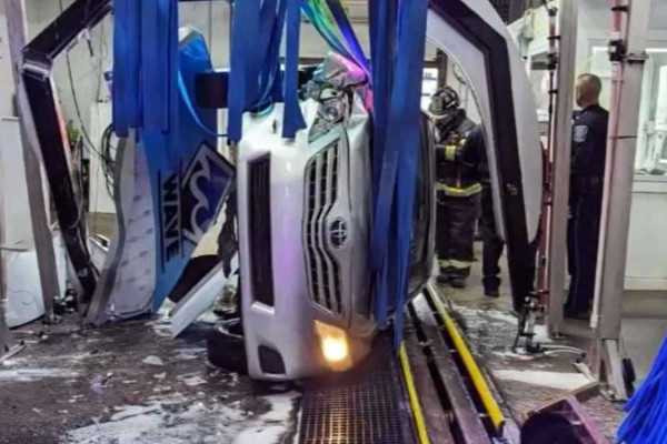 A 77-year-old Driver Crashes And Rolls His Vehicle Inside A Car Wash