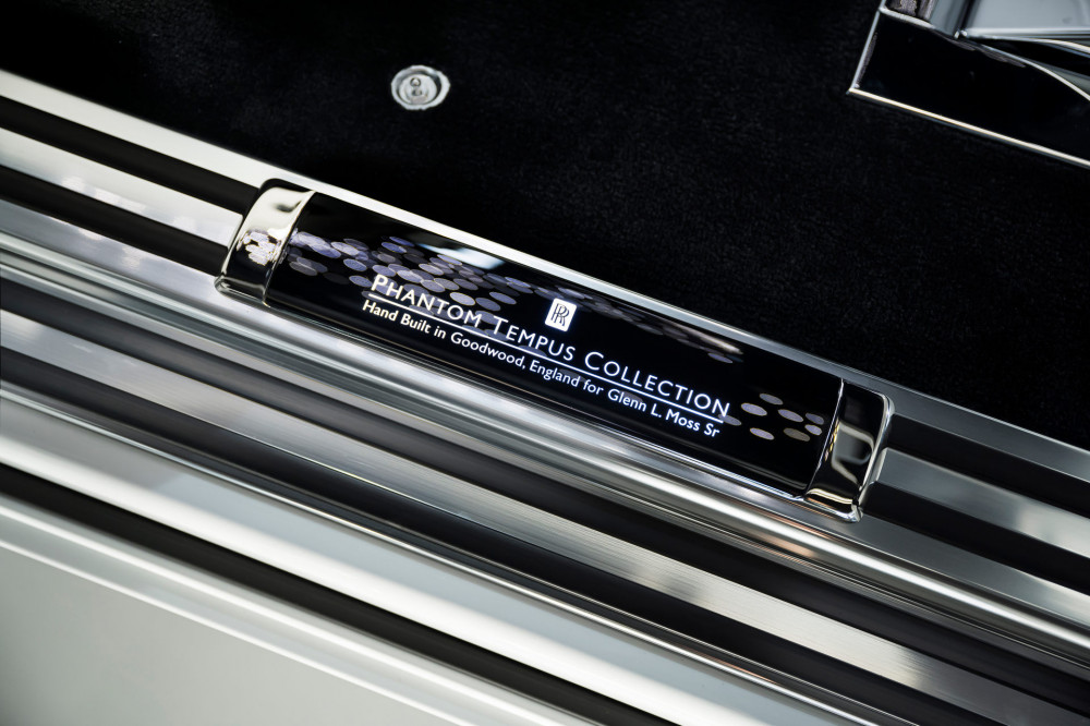 The illuminated treadplates display, "Phantom Tempus Collection - Hand-built in Goodwood England for Glenn L. Moss Sr." when the door is opened. With hand-crafted Arctic White leather offset by black accents, piping, and contrast stitching, the interior closely resembles the stunning exterior.