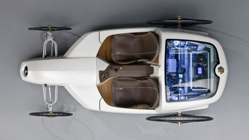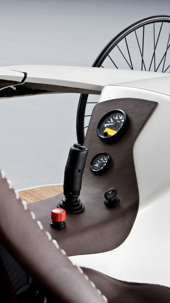 The cabin comprises all sorts of influences, like carbon fiber seats covered in handcrafted leather, suspended on a wooden floor. A joystick is used to replace the regular steering wheel and pedals.