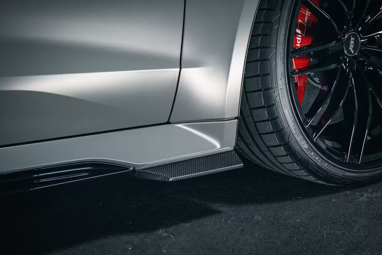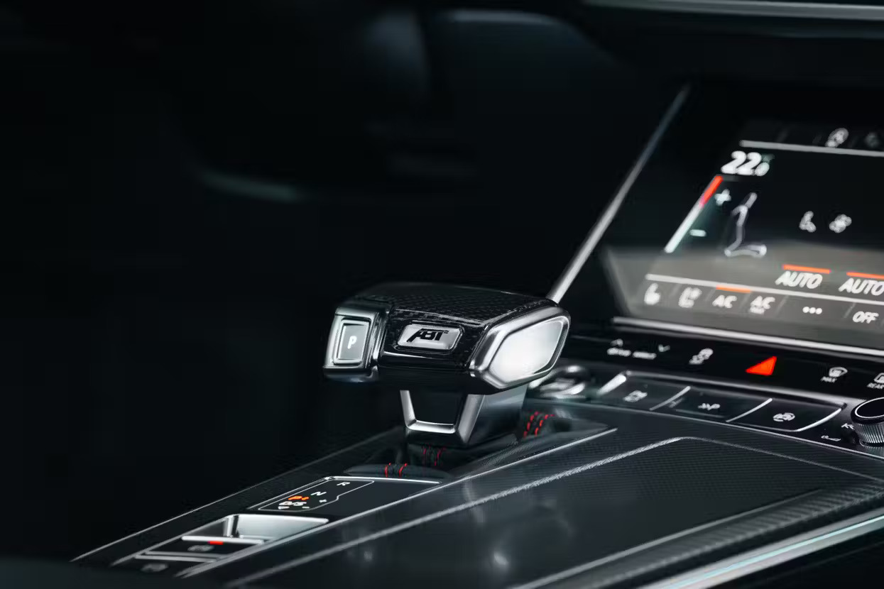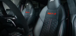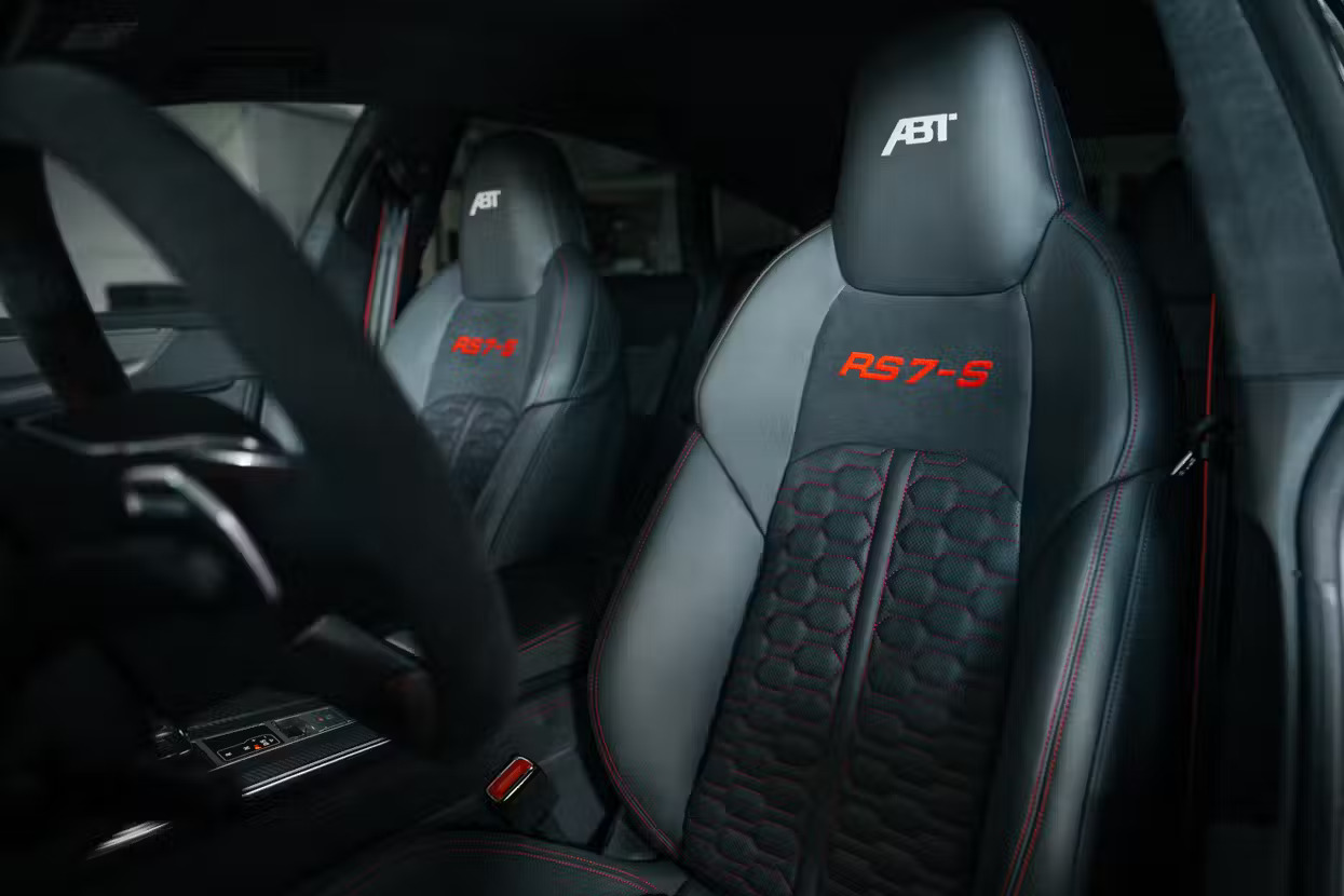 The package includes an ABT stainless steel exhaust system with four matte black tips and electronically controlled adjustable valves, along with a reworked diffuser in the rear. Refinished seats, floor mats with the RS7-S emblem, splash lighting, and an ABT shift knob cover crafted from gloss black carbon complete the interior.