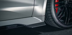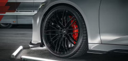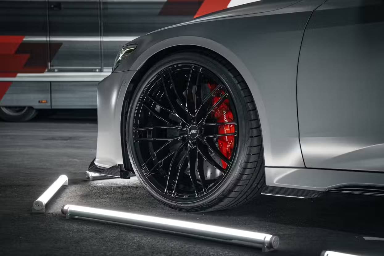 Glossy black carbon fiber completely constructs the model's aerodynamic kit. It's got a red RS7-S-lettered front lip, front blades, stylish side skirts, and a spoiler for the trunk lid. The gloss black ABT High-Performance wheels are 22 inches in diameter.