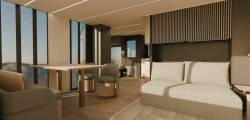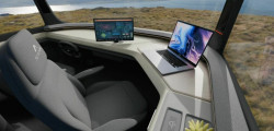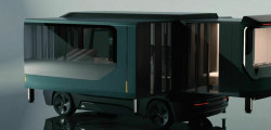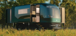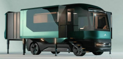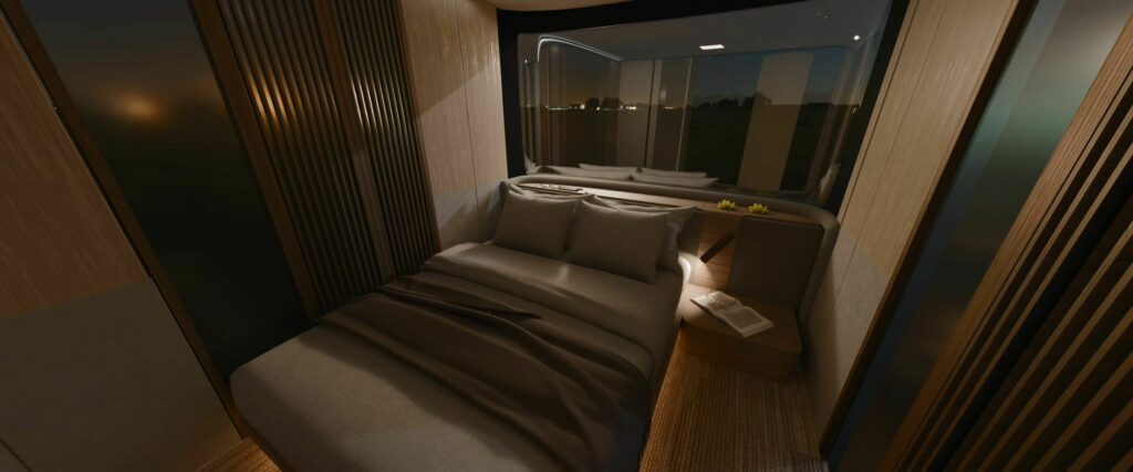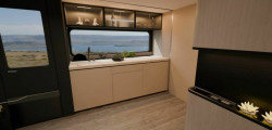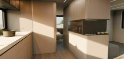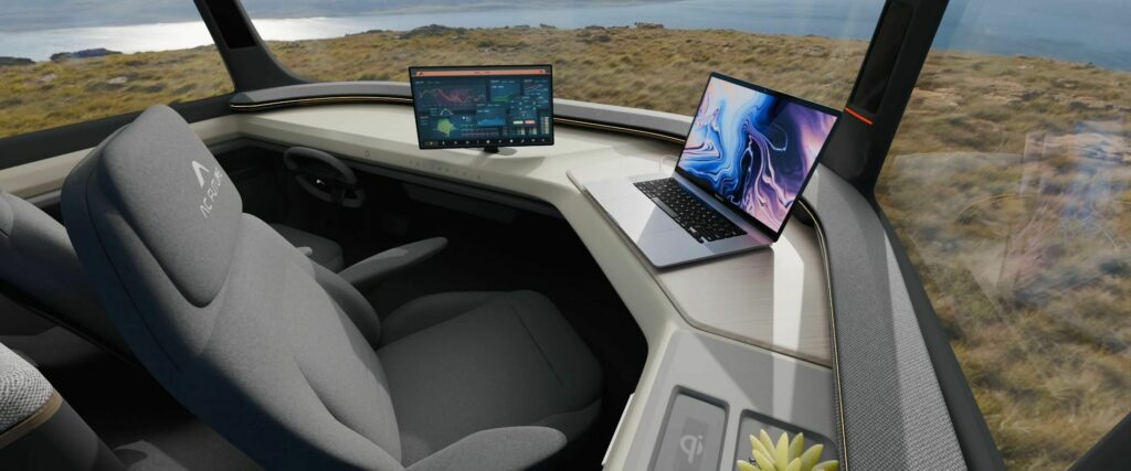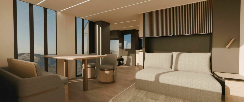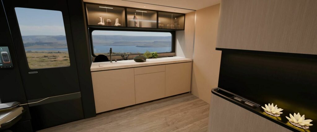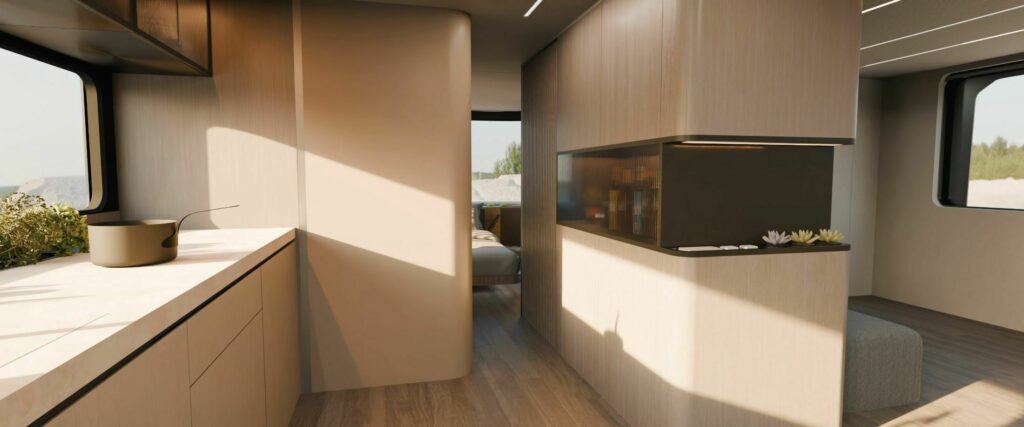 Inside, a modern and opulent ambiance prevails in the living room, kitchen, bedroom, and bathroom, complemented by collapsible and modular furniture. Taking versatility a step further, the dashboard transforms into a workspace through a retractable steering wheel and rotating seats.