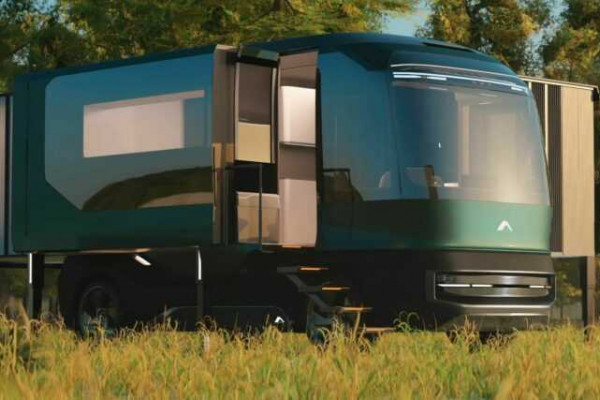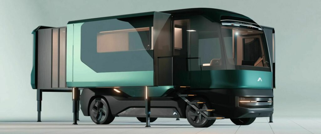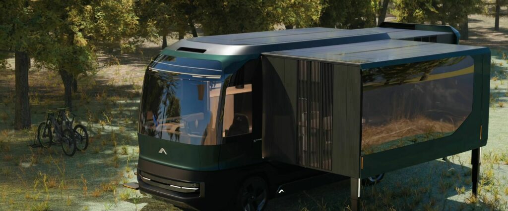 The exterior boasts a boxy design with sleek LEDs and a bus-like greenhouse. The standout feature is its movable side and rear walls, extending the interior to a spacious 400 square feet. This adaptable space can serve as a second home for adventurous families or a dynamic mobile office for digital nomads.