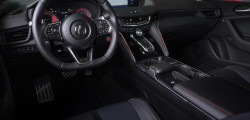 Inside, the TLX Type S PMC Edition maintains its carbon fiber trim characteristics, which are complemented by lighted side sills and luxury floor mats branded with the Type S logo. Inside the Curva Red cars is an Ebony cabin with red contrast stitching. The cars painted 130R white have a special Red interior, while the ones painted Long Beach blue have an Orchid interior with blue contrast stitching.