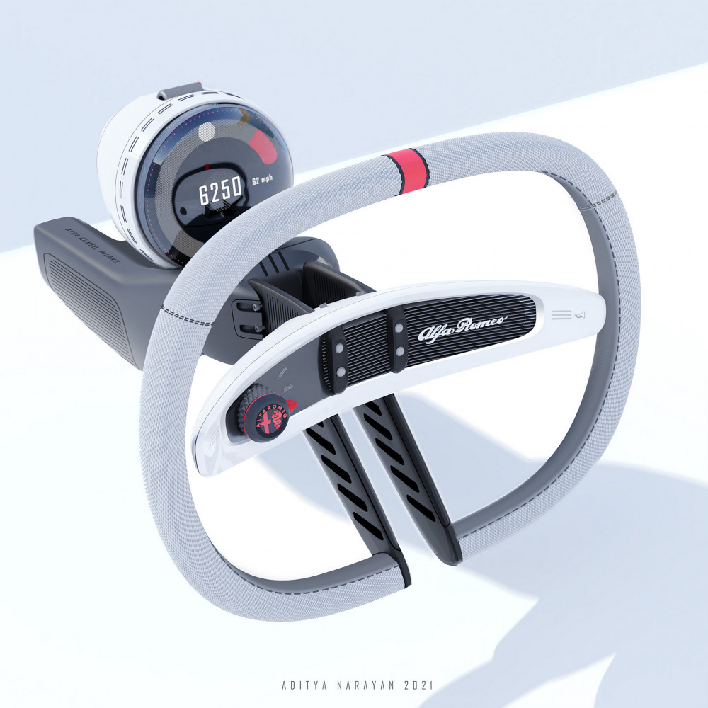The Periscopica's interior is just as fascinating as its outside. A circular instrument cluster and a flat-bottomed and flat-top three-spoke steering wheel are located immediately in front of the driver. The car then has a set of five circular displays where an infotainment panel would normally be. Narayan has also created his ideal Alfa Romeo with a stick shift to increase driver participation.