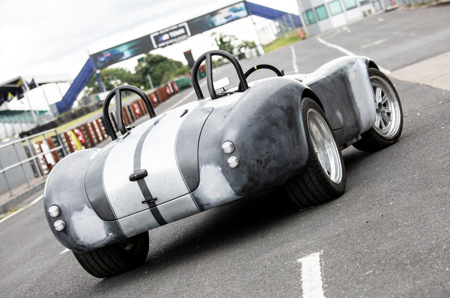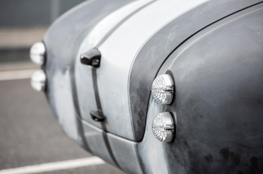 The Cobra on axle stands is currently a dismal, boring grey, with only spots of rubbed-down filler to break up the monotony. What used to be openings for a fuel filler and exhaust exits have been covered up by those patches. These are no longer required by this Cobra, which is built on a Dax-bodied replica.