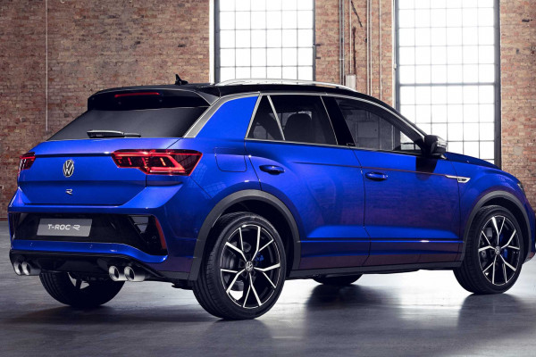 Unique front and back bumpers, dark headlights, vertically stacked daytime running lights, 18-inch Jerez alloy wheels, silver wing mirror caps, a tailgate spoiler, and an optional Akrapovic exhaust set the T-Roc R apart.