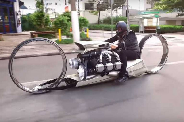 The TMC Dumont is a concept art motorbike designed and produced by Tarso Marques, a former Formula One racer and designer. Driven by a genuine Rolls-Royce Continental Aircraft Engine from 1960, this amazing, hubless wheel motorbike has a 300 hp, six-cylinder motor.