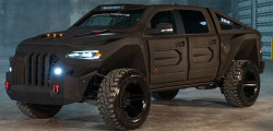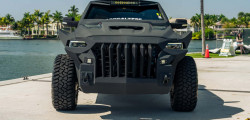 The Apocalypse 4x4 Super Truck's body panels have hit the gym and are now flexing some serious muscle. The truck's wheel wells are so intricately designed, they could give even the most heroic vehicle an evil makeover. Rolling on some serious bling with 22-inch SFJ wheels and 40-inch Fury Country Hunter mud-terrain tires.