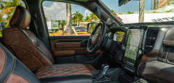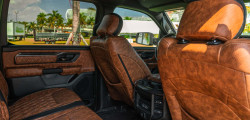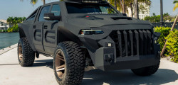 The impressive grille design gracefully envelops the headlights, with grand vertical slats that elegantly extend towards the ground forming the centerpiece. The bed comes with a convenient retractable slant-back that is weatherproof and a roll-and-lock cover, and, according to Apocalypse, the bed is nearly eight feet long.