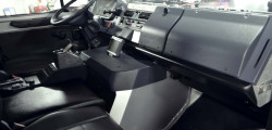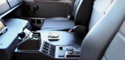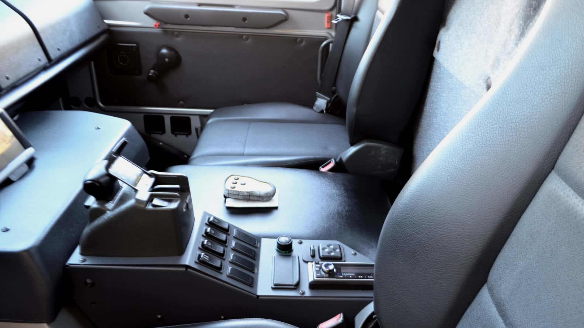 The cargo bed comes equipped with a roll bar, rear-facing lighting, and a bench with seatbelts for extra passengers. Under the hood, a robust turbodiesel 6.4-liter inline-six engine generates a reported 320 horsepower. The truck features a five-speed manual transmission, four-wheel drive, 22-inch wheels, chunky 445/65 tires for ample traction, and air suspension.