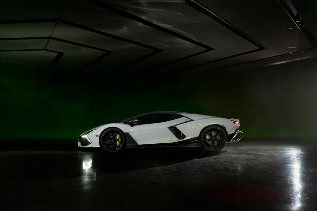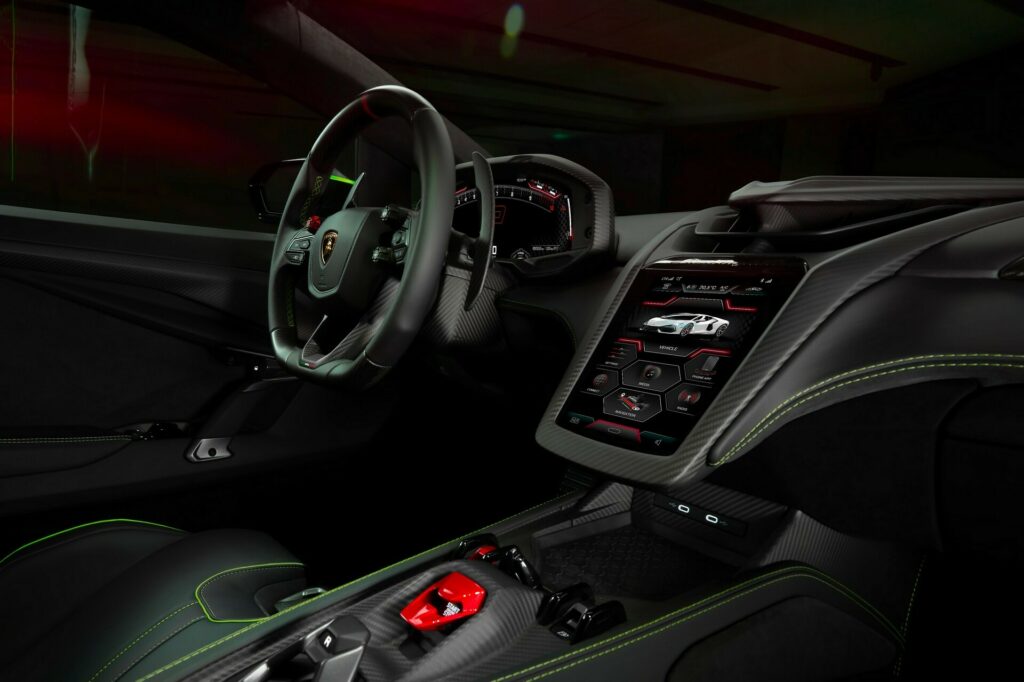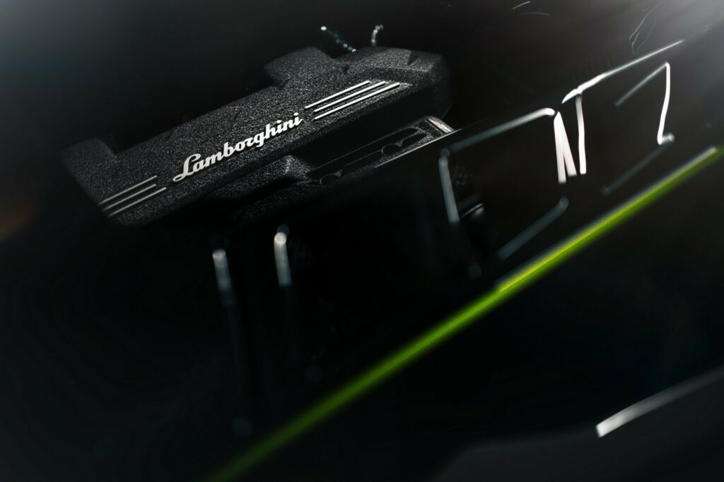 The top, engine cover, and rear diffuser of this Revuelto are just a few examples of the exposed carbon fiber features. The alloy wheels, 21 inches up front and 22 inches in the back, have a high-gloss black finish. The Ad Personam team at Lamborghini really enjoyed themselves while customizing the vehicle. In the cabin, the color scheme of black and green persists. The Nero Ade sport seats are a notable feature, including Verde Scandal stitching and piping.
