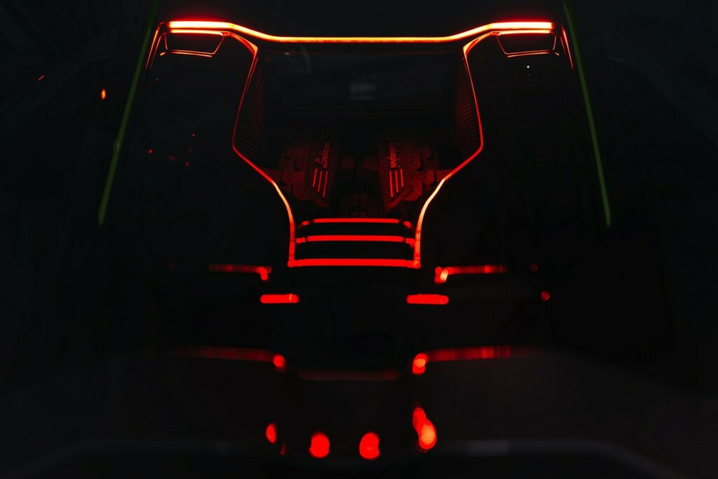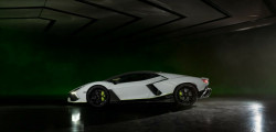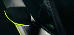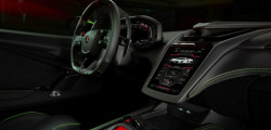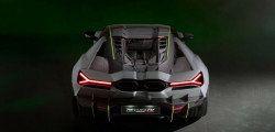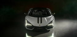 As opposed to the Grigio Hati paint, the front bumper, side skirts, rear diffuser, wing mirrors, and engine cover are adorned with a variety of Verde Scandal (green) components. Verde Chiaro is the name of the bright green paint job that the brake calipers have as well. The vehicle has also been adorned with a set of black racing stripes.