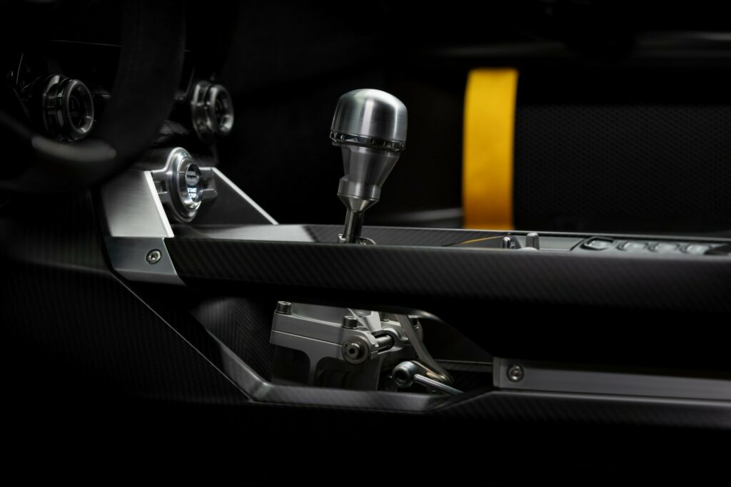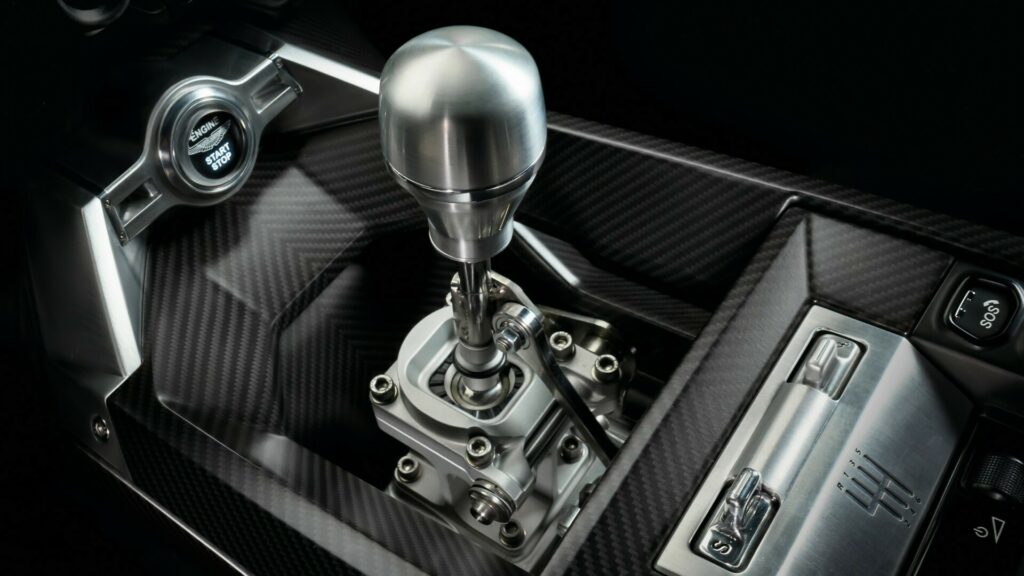In addition to a new carbon fiber diffuser, the Aston Martin Valiant has side skirts reminiscent of Formula 1, a towering fixed rear wing, and more. Though the downforce is unknown, it has better traction than the Valour. The Valiant has also altered the transmission tunnel, featuring a cutaway that showcases the breathtaking shifting linkage.