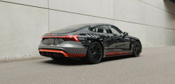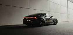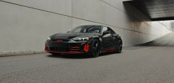Black 21-inch concave wheels complement the red calipers of the carbon ceramic brake system on this limited editionRS E-tron GT. Carbon fiber is also used for the roof, mirror covers, and door inlays. Other features include laser headlights in an HD matrix style.