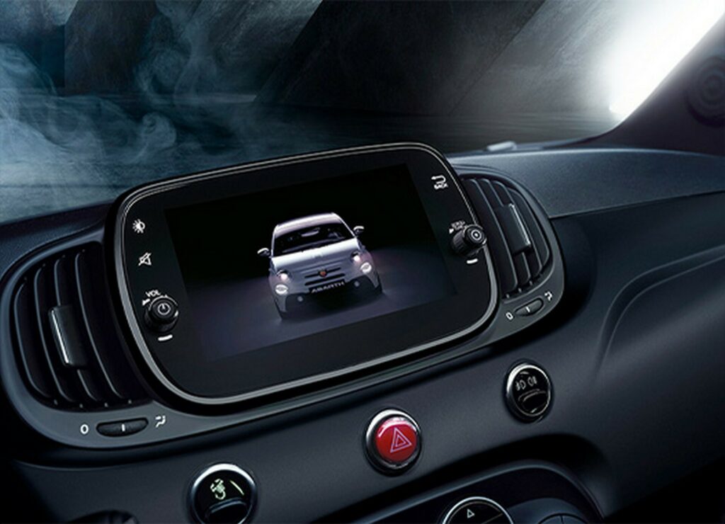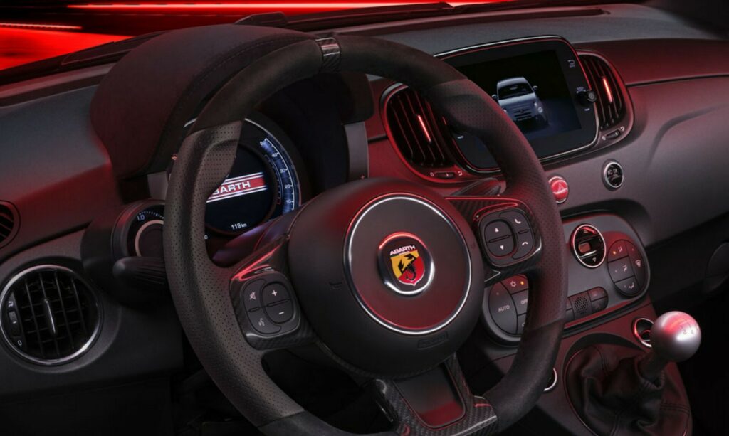 Notable features of the 2023 Abarth 695 Competizione include Koni suspension for both the front and rear, 17-inch alloy wheels, yellow Brembo brake calipers, tinted privacy glass, a 7-inch infotainment system boasting support for Apple CarPlay and Android Auto, and a 7-inch digital instrument cluster. The dashboard has a striking matte black finish, and the steering wheel has a luxurious black Alcantara wrap with carbon fiber accents.