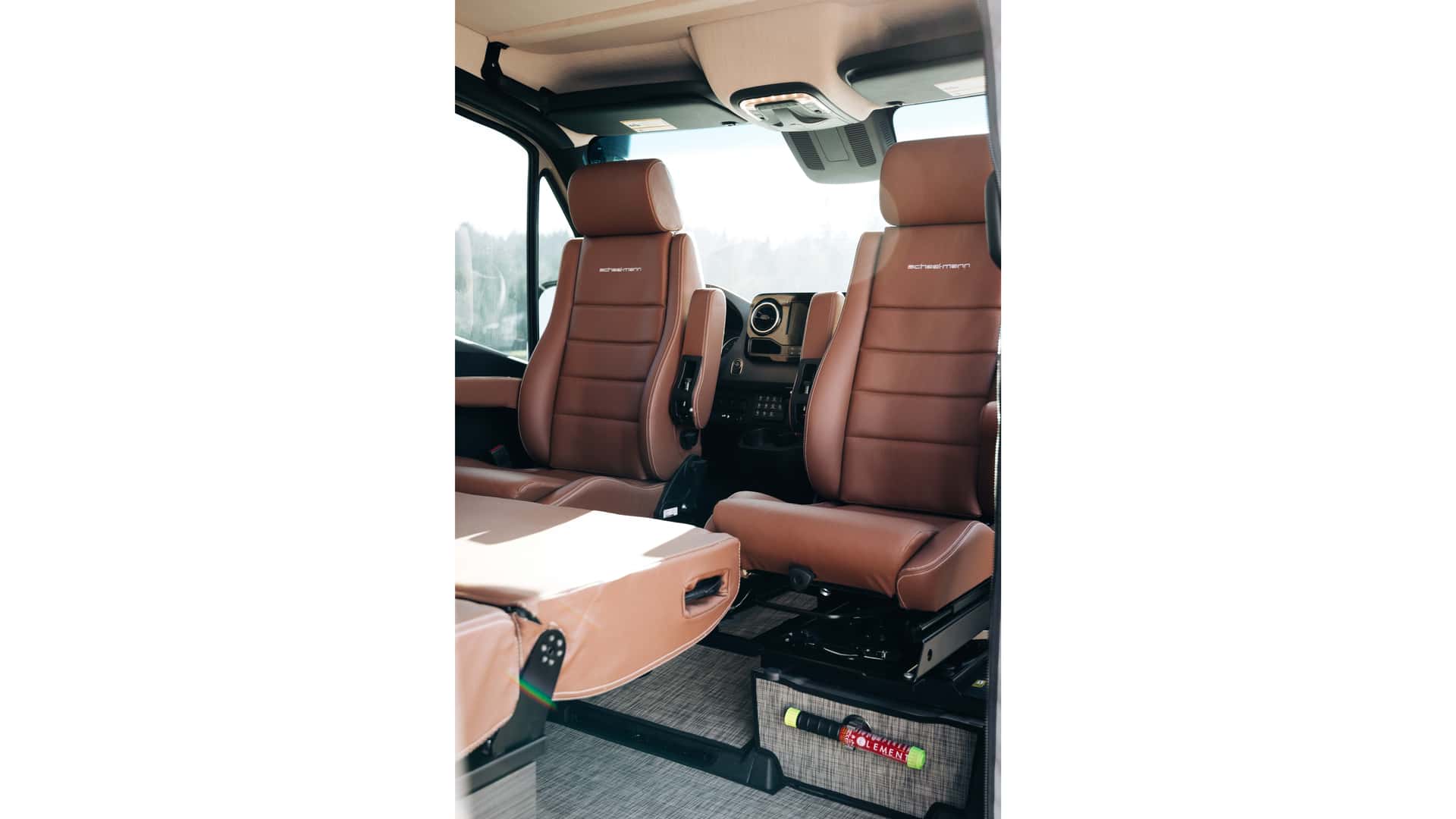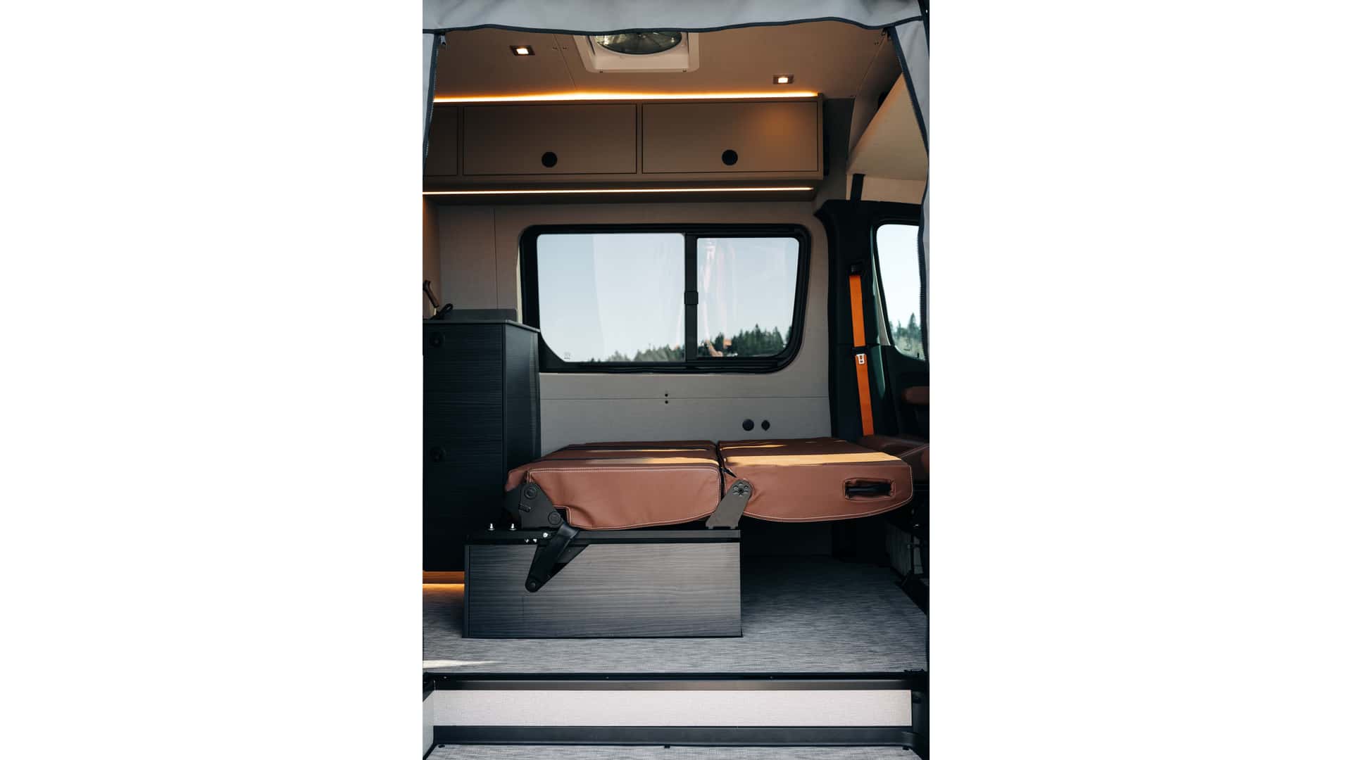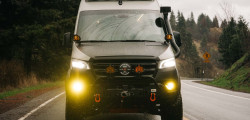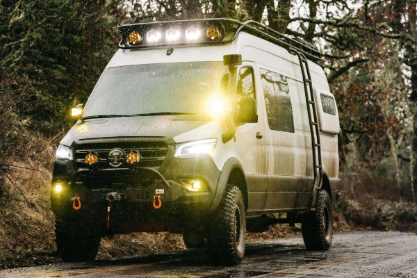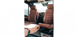 The van can handle a wheel 36 inches off the ground. Additionally, it can effortlessly traverse mud bogs as deep as 18 inches. Under the hood, the powertrain is a 3.0-liter turbodiesel V6, paired with a seven-speed automatic transmission. Stepping inside, the cabin boasts swiveling front seats that give access to a convenient table.