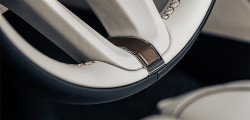 It's clear that a lot of care and attention to detail went into the interior of this vehicle. Seats and door panels are upholstered in white leather with satin bronze accents and piping, providing a striking contrast to the dark beluga secondary color.