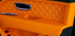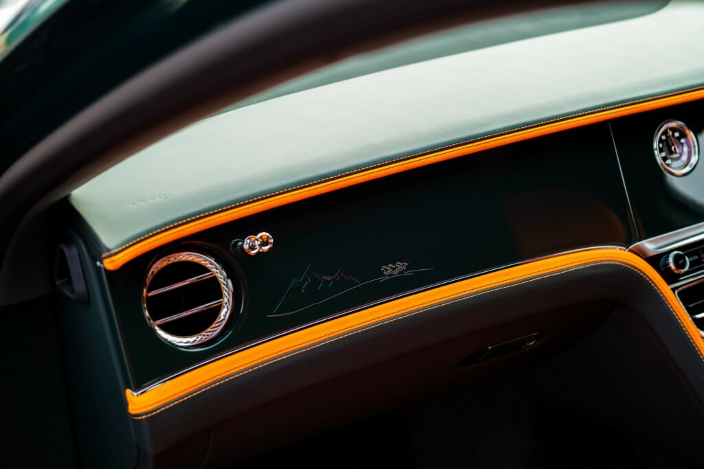 Every one of the three Bentayga EWB Azure cars that have been manufactured so far is a four-seater, and in the space between the back seats, you can find the optional Mulliner console bottle cooler. Cumbrian green and Mandarin orange leather with contrast stitching and headrests embroidered with Azure are also used in their interiors.