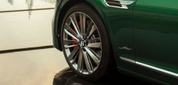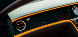 Then, there's the Flying Spur Opulence Edition. This one boasts 22-inch dark-tinted Speed wheels with self-leveling wheel center caps and an illuminated Flying B insignia up front with a polished stainless steel finish, just like the Continental GT Speed. As for the interior, it has diamond-knurled bezels and switchgear in addition to the familiar orange and green leather found on previous versions.