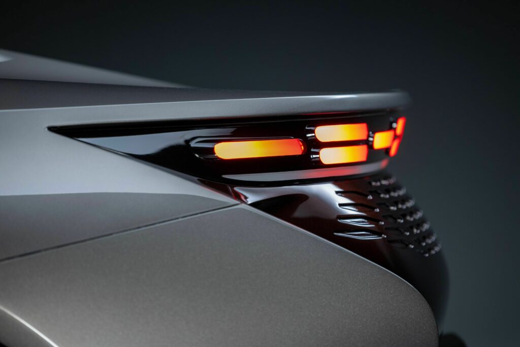 The GB110's front end features two small headlamps and a thin strip of bodywork that stretches between them, slightly raised above the hood, similar to the R-wing on the Dodge Charger EV.