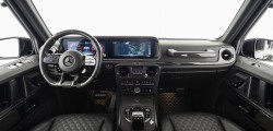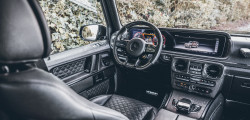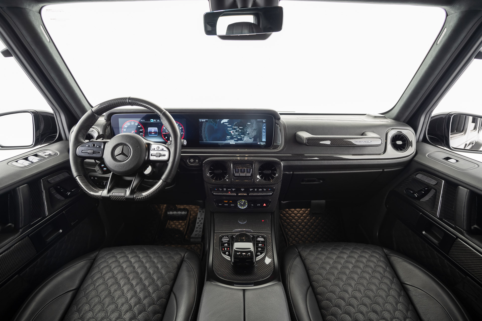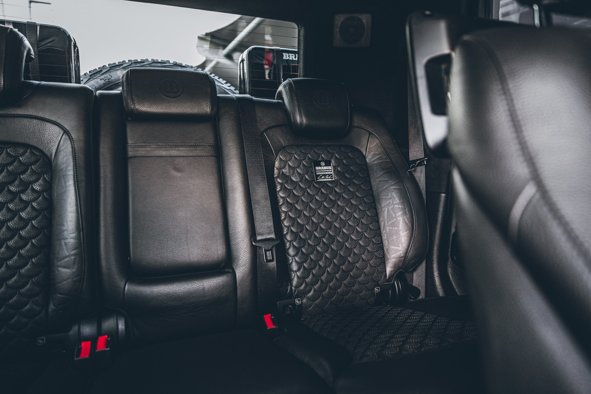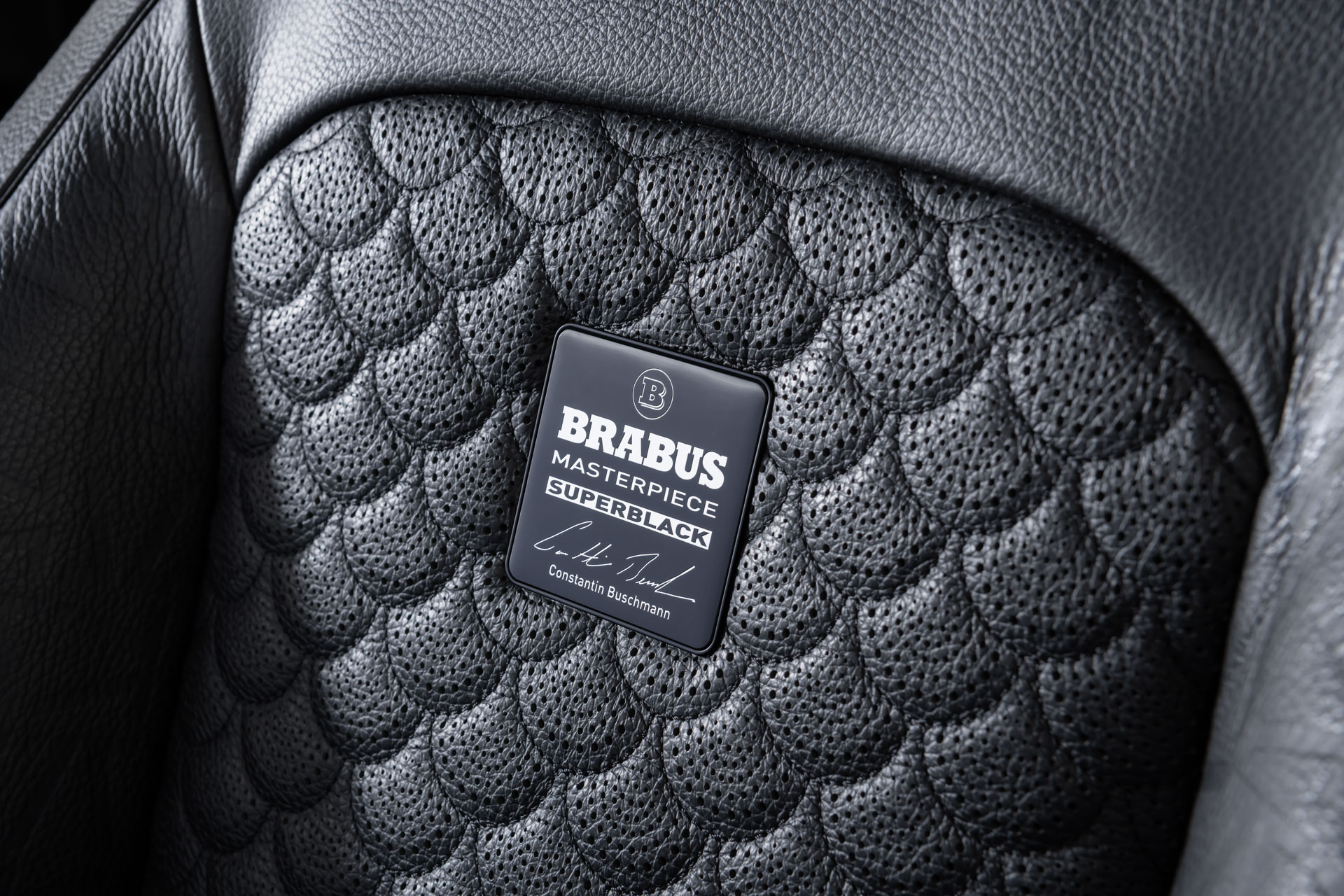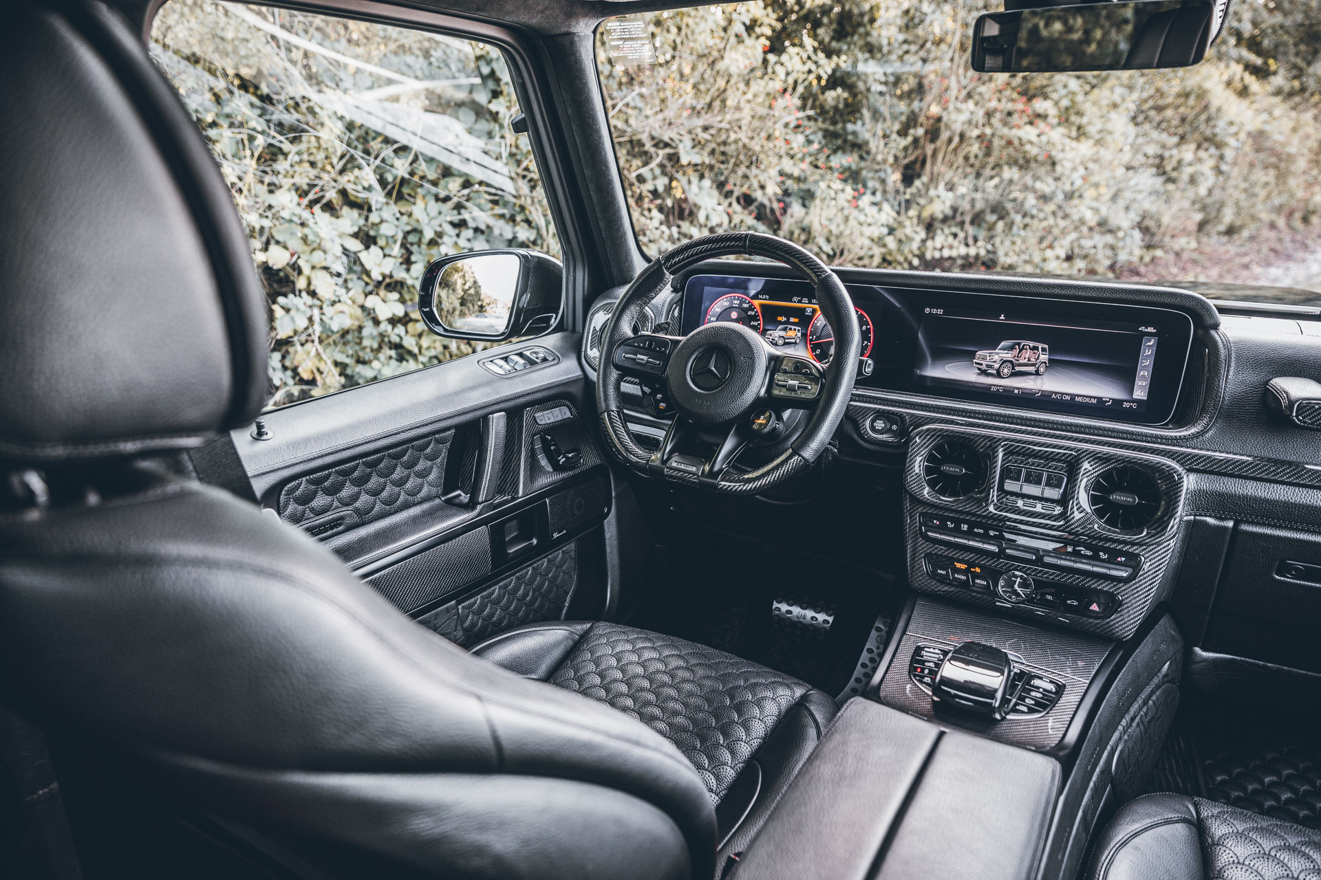 The inside of the Brabus 800 Adventure XLP was given the "Brabus Masterpiece" treatment, with an all-black color scheme. The inside has unique quality leather upholstery on the seats, door cards, footwells, and trim components, as well as lots of carbon-fiber trim on the center console and black trim throughout.
