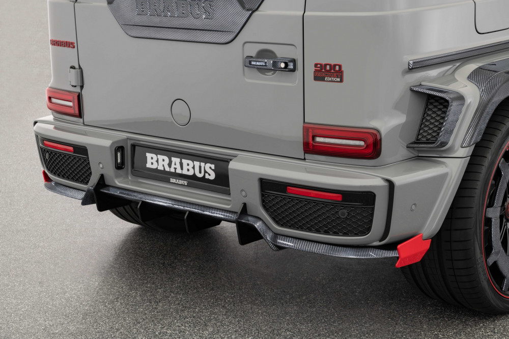 The novelties on the exterior comprise a carbon-fiber grille, featuring the Rocket Startup Glow, a new front spoiler, a new roof spoiler, and various exhaust pipes that come out on the laterals. The presented model is finished in Stealth Gray and has red details painted across the body. However, Brabus announced that it can paint the vehicle in any color.