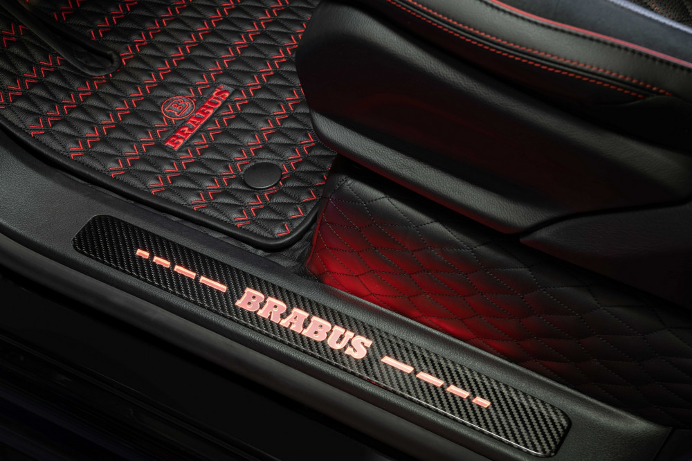 The interior of the car is covered in black leather upholstery, featuring crest-shaped quilting. There are four individual heated and ventilated seats. The other details worth mentioning are the 4.3-inches control panel, retractable tables with heated/ventilated cup holders, carbon fiber elements, aluminum pedals, color-changing Brabus logo, and a refrigerated compartment.