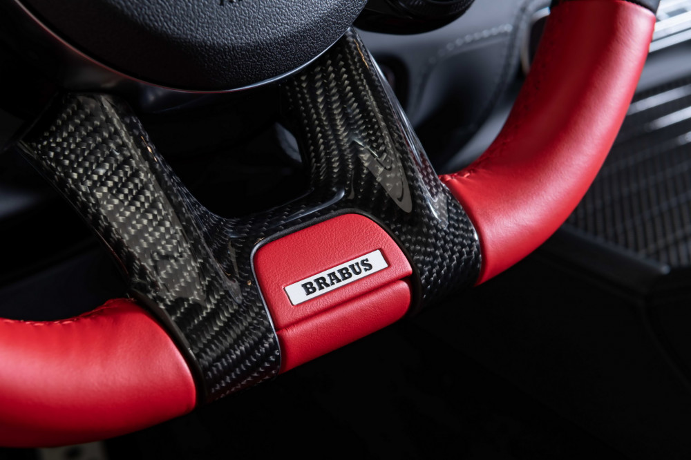 The OEM wheel arch trim has been successfully replaced with carbon elements. Also, there are a new front spoiler lip, upgraded side air intakes in the bumper, tweaked grille, rear diffuser inserts, and roof spoiler, and striking red accents. A re-trimmed cockpit upholstered in the finest leather, contrasting with the carbon fiber and metal elements in the car’s interior. For a much lighter look, Brabus 800 features sills backlit in warm tones.