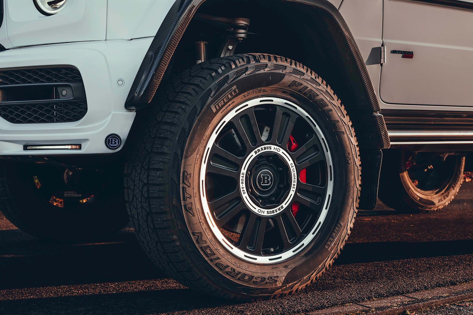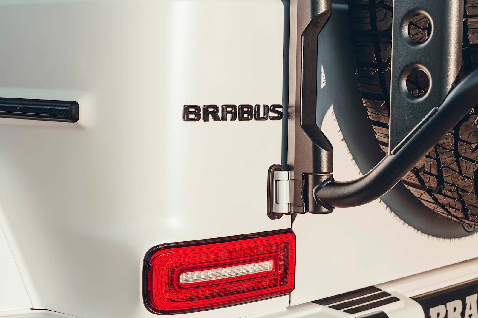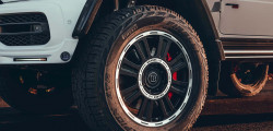 Above the windscreen, there's a new wind deflector featuring LED spotlights, which can be useful during nighttime explorations. You can also choose from practical accessories, such as a Brabus roof rack and cable winch, which serve a functional purpose. The 22-inch Monoblock HD forged wheels have a matte black finish with silver accents and come equipped with chunky Pirelli Scorpion all-terrain tires, perfect for this AMG G63 4x4 Squared.