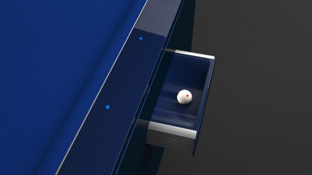 The pool table is lavished in Bugatti's style - high-quality materials, carbon fiber finish, and machined aluminum and titanium underpinning the frame. For the sides the brand manufactured the drawers with brushed and anodized aluminum, the ball pockets are stainless steel and lined with leather and obviously the Bugatti logo.