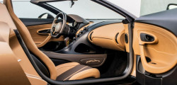 The roof, which features carbon fiber ram induction air intakes behind the headrests, is another area that has been meticulously designed. Along with cooling the W16 engine, these intakes also serve to sustain the vehicle's weight in the event of a rollover. Using opulent woven leather on the door panels and a custom sound system made for the Mistral, Bugatti shows their commitment to an effortless open-top driving experience.