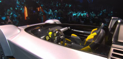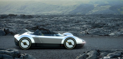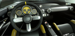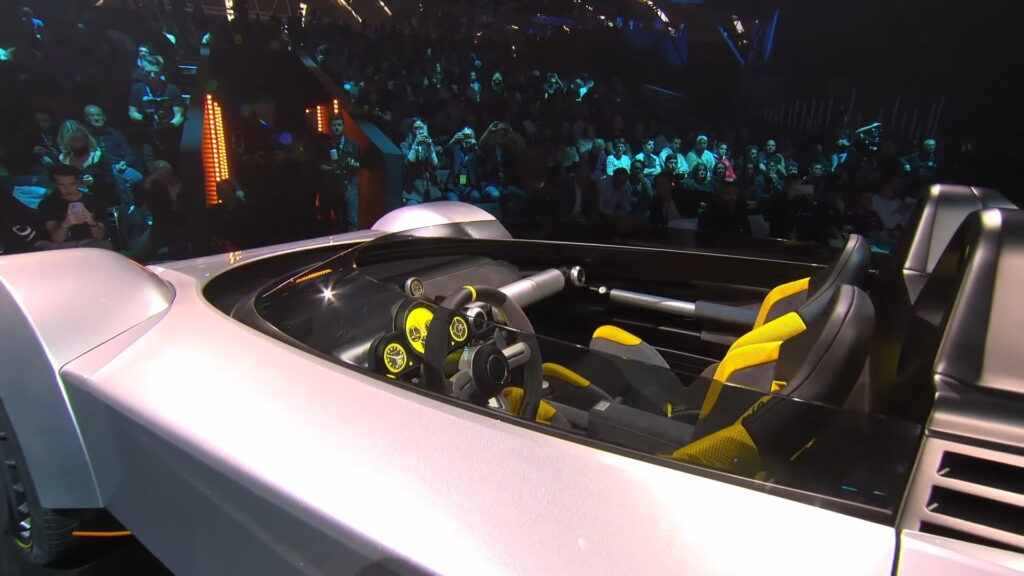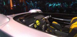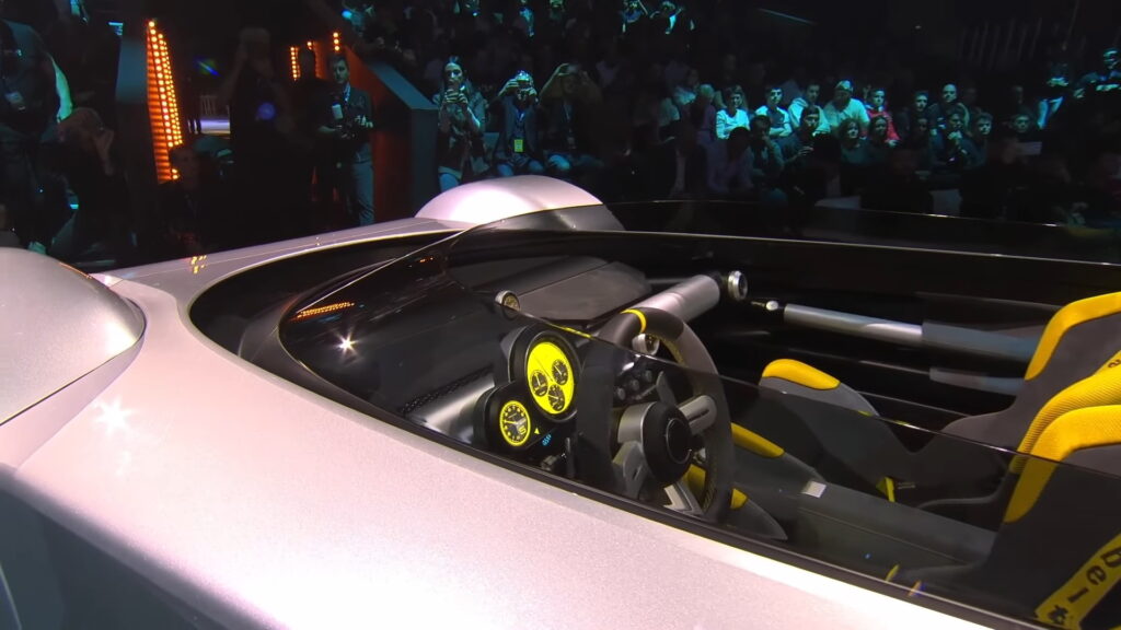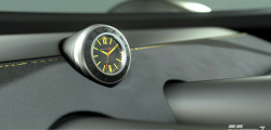 The speedometer at the center of the instrument binnacle closely replicates the watch, incorporating three subdials. The exterior design of the car diverges from the watch, drawing inspiration from Italian concept cars of the '60s and '70s, notably evoking the wedge-shaped profiles of iconic vehicles like the Lancia Stratos Zero and the original Lamborghini Countach concept.