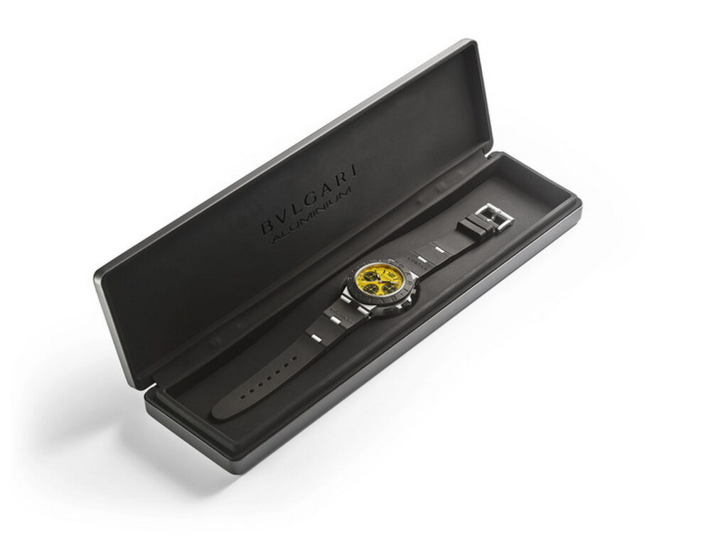 Available in yellow and anthracite, the watch's design reflects the automotive aesthetic. At the same time, the Bulgari Aluminum Vision Gran Turismo concept mirrors the watch's design cues.