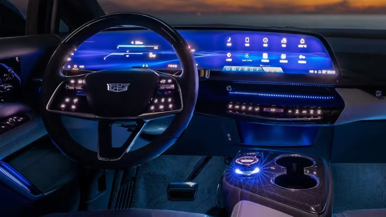 Just in time for its debut at the Beijing Motor Show (April 25–May 4), Cadillac has shown the inside of the brand-new Optiq EV. The Optiq borrows features from its larger sibling, the Lyriq, including a three-spoke steering wheel, a large driver's display, and an infotainment screen housed under a single pane of glass.
