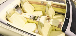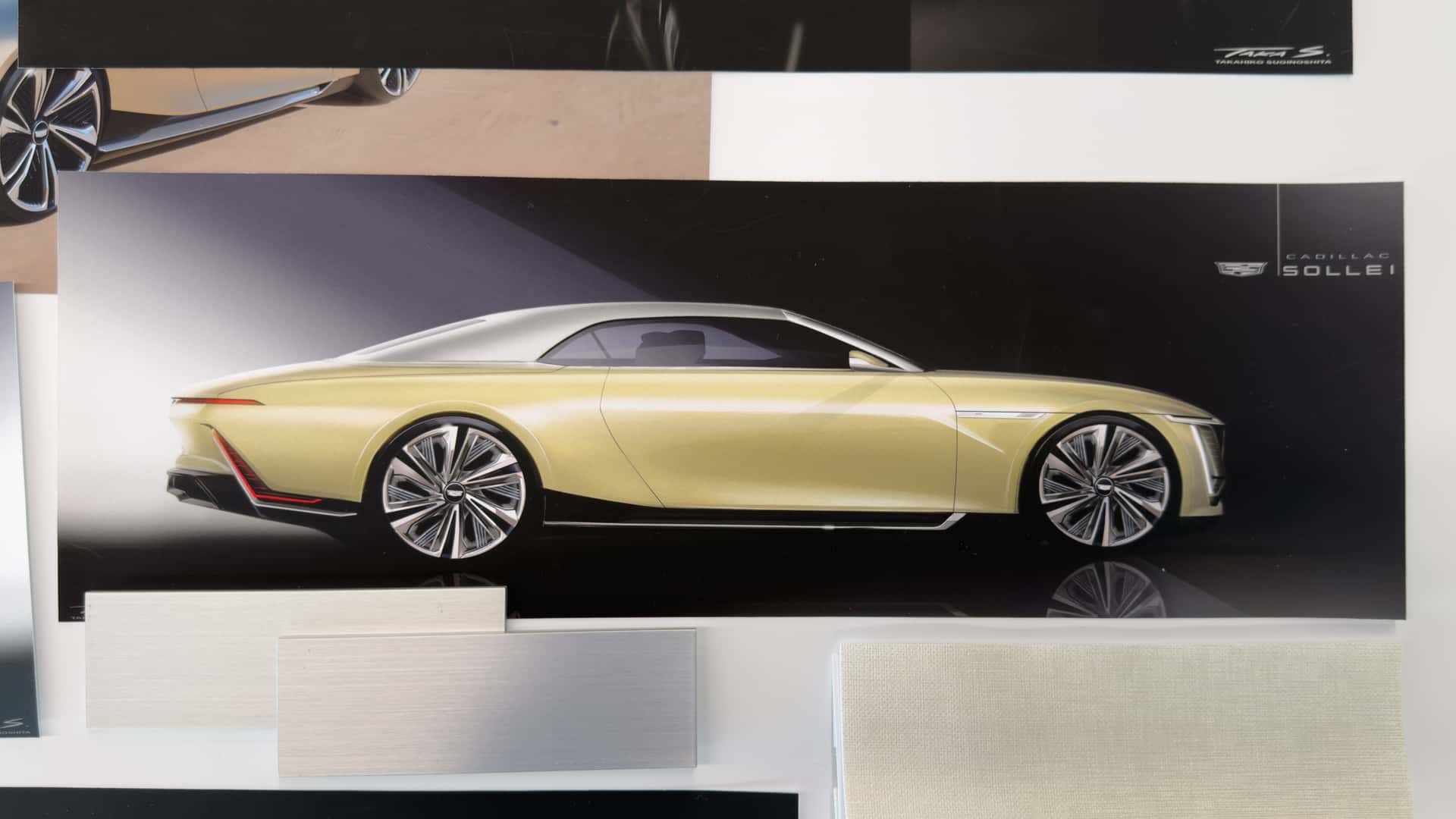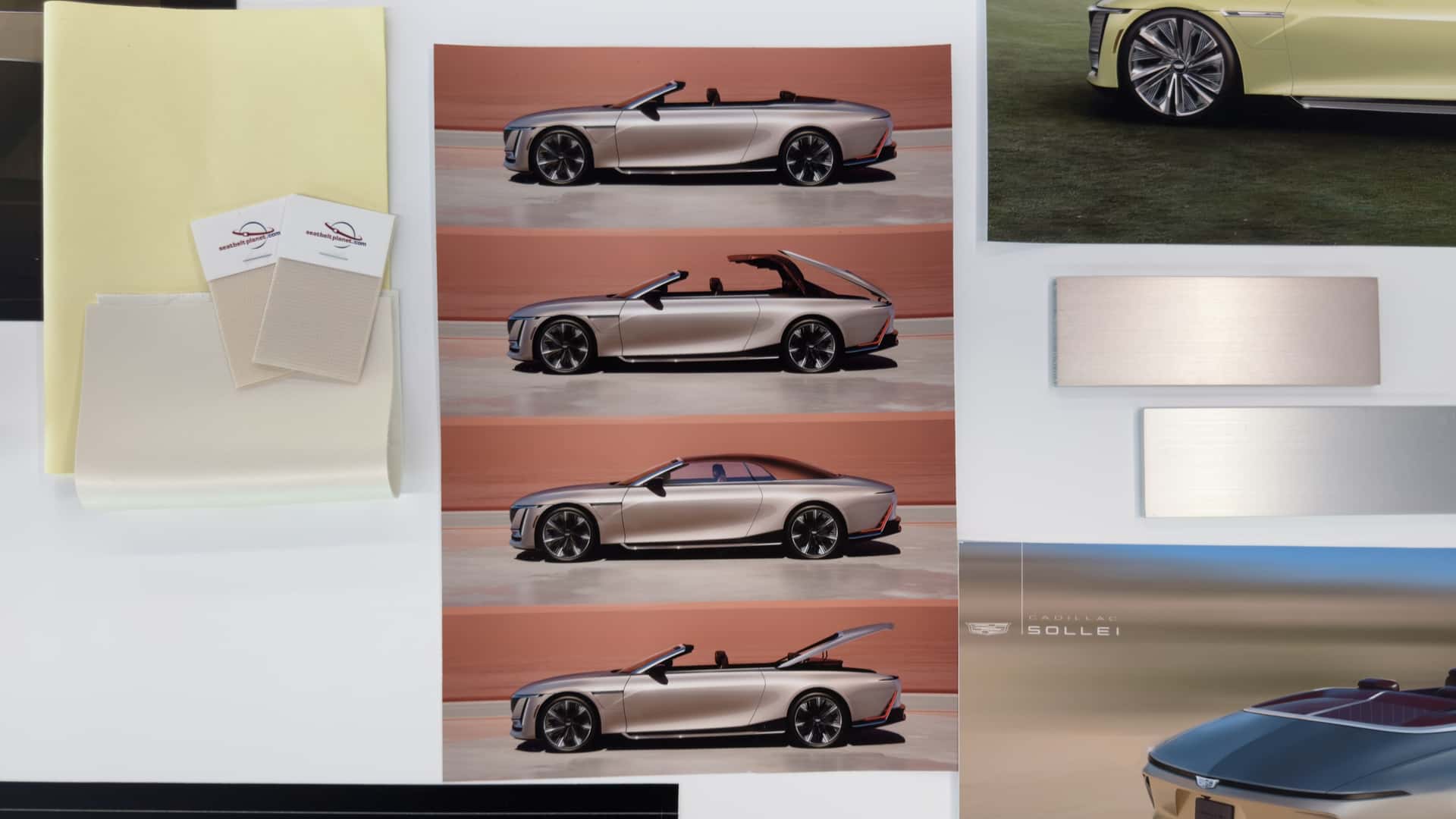 "Everything that looks like metal is metal," she added. The seats inside feature a sunburst pattern in the quilting, stitching, and perforation. A pink iridescent pigment dyes the Nappa leather, causing it to change colors. Another first for Cadillac, the Sollei incorporates Fine Mycelium, a novel, sustainable bio-based substance, used for charging mats and door pockets.