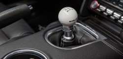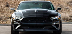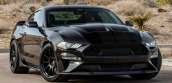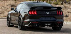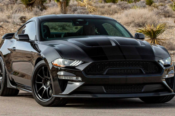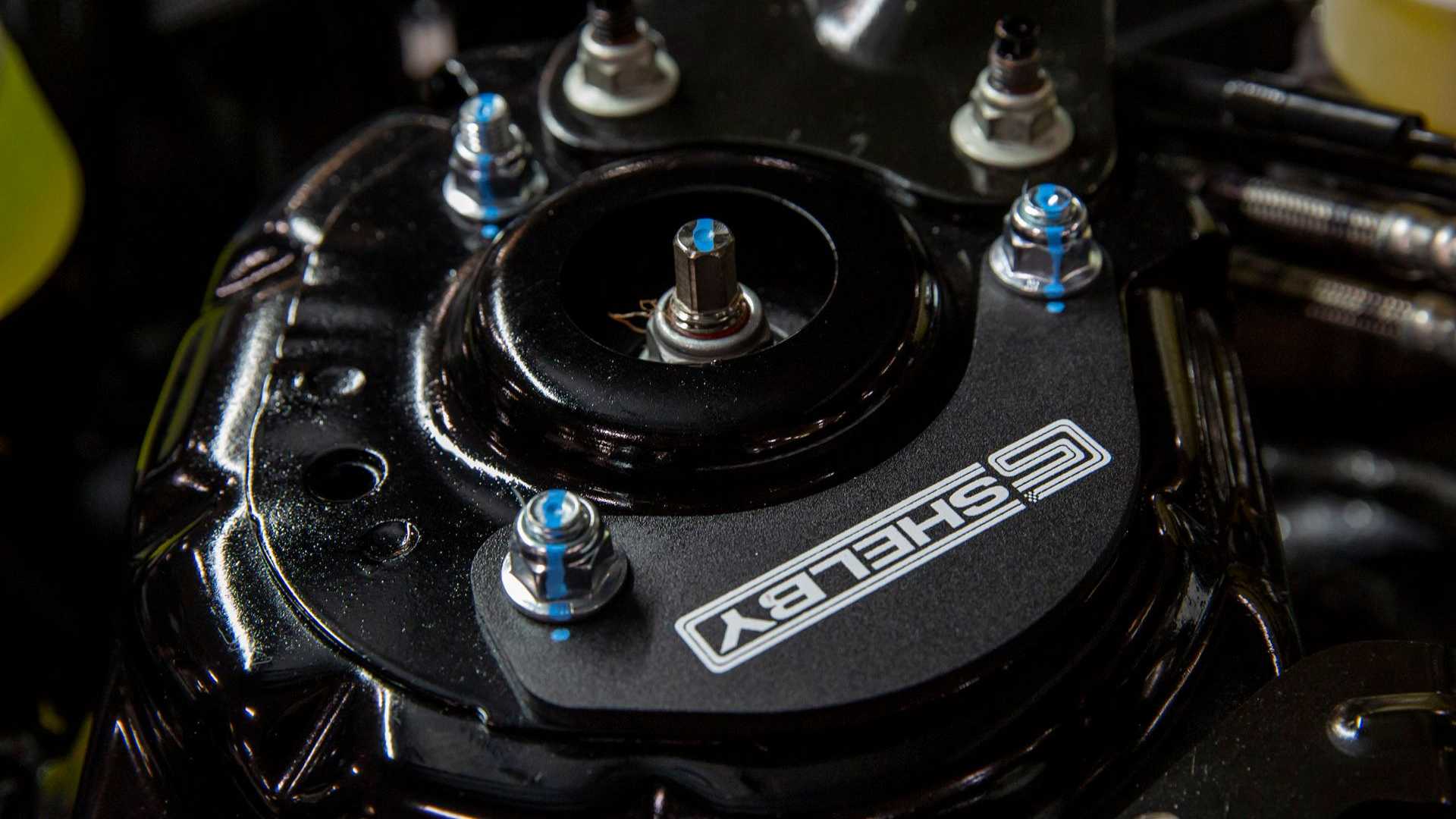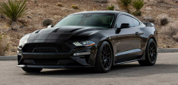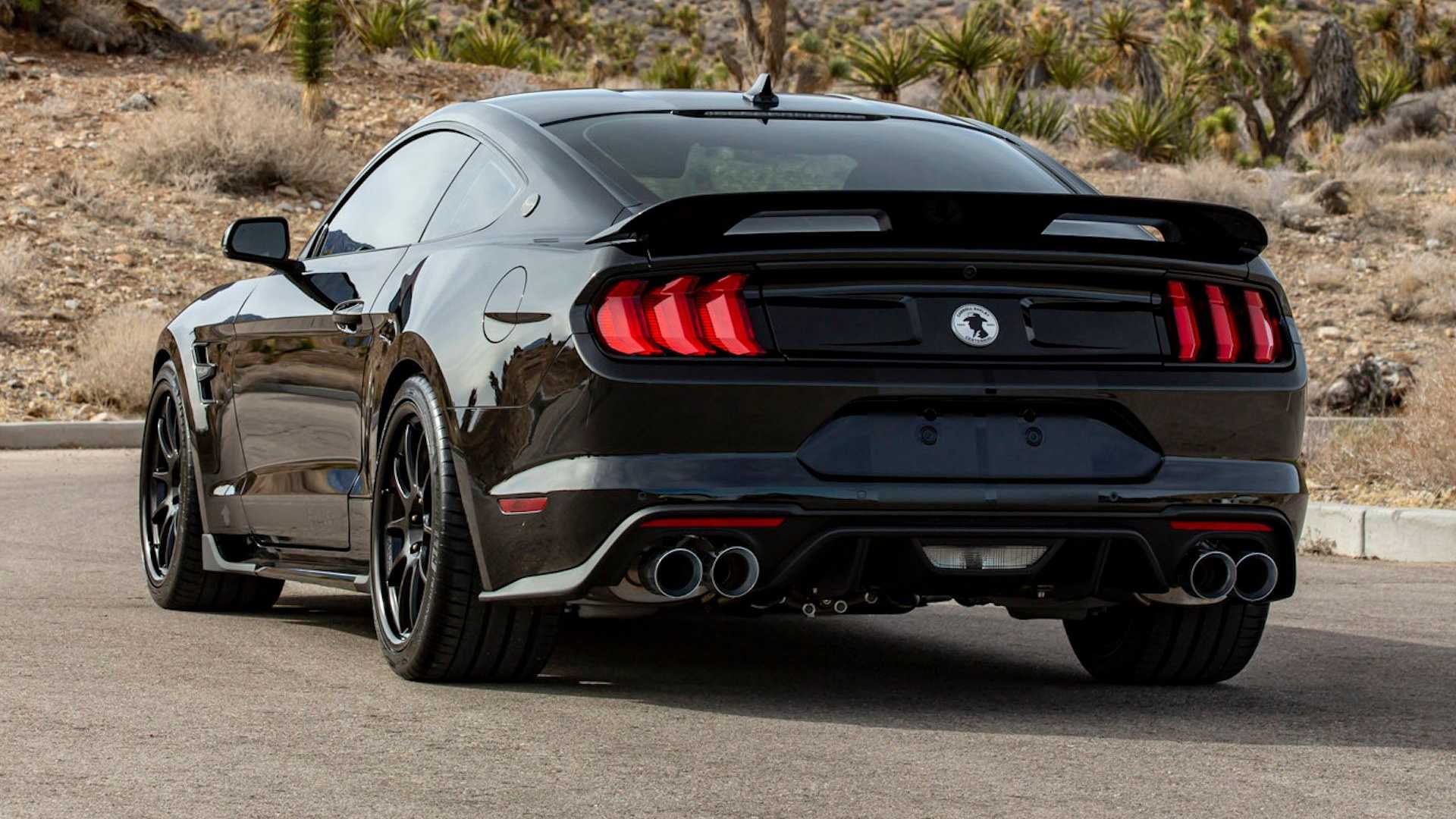 Additionally, there is Le Mans outrageous satin black vinyl striping. Interior features include Carroll Shelby Centennial Edition badges and emblems on the door sill plates, floor mats, and leather upholstery. The 5.0-liter V8's output is increased to 750 horsepower thanks to a black Shelby supercharger that has a gauge pod.