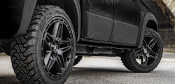 The blacked-out 22-inch RS-XF wheels look great with the hefty Mud-Terrain tires and suspension raise package. The Dark Destroyer also comes with bullet-proof tinted windows and a hard-top for the back bed as an alternative.