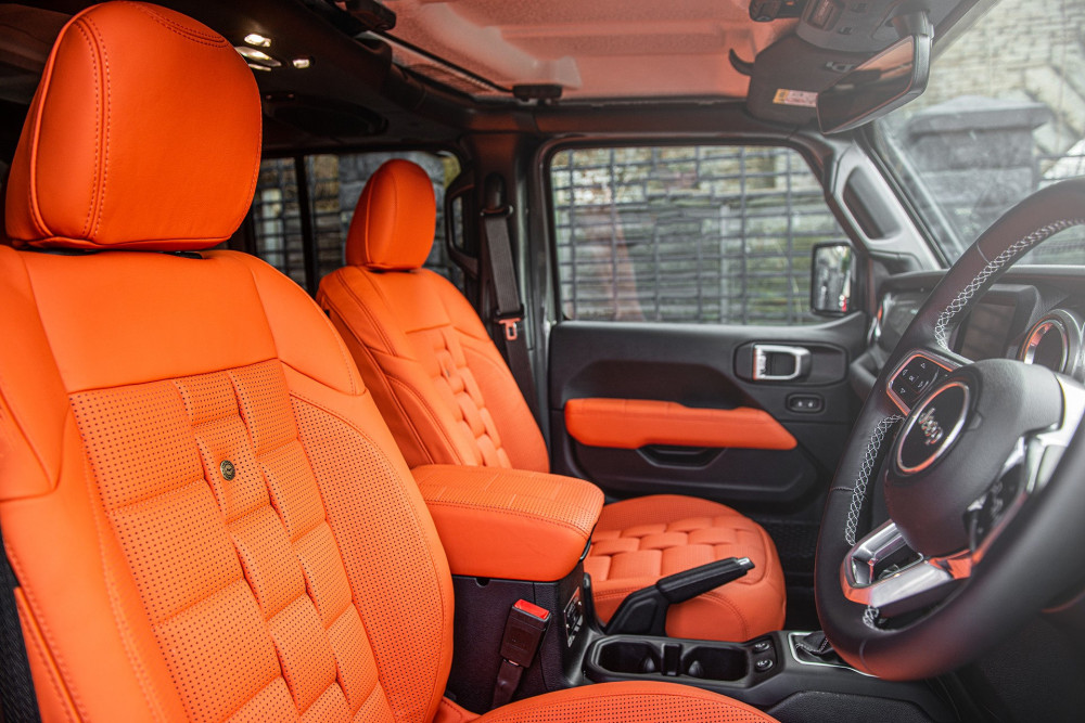 The cab is modified as well. The owner of this Wrangler had the seats, center console, and parts of the door panels covered with Volcanic Vesuvius-colored leather. If the orange isn't your style, Chelsea Truck Company can replace it with leather upholstery in a variety of colors and tones.