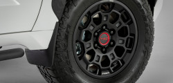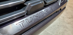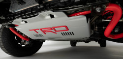 A distinctive grille with “TOYOTA” lettering and an integrated light bar distinguishes the Tundra TRD Pro. Also, the vehicle has “technical camo” on the bumpers and fender flares, among other defining features. The bonnet and tailgate also have “TRD Pro” stickers on them. Also on the truck: a TRD-branded aluminum skid plate; red chassis parts; and 18-inch wheels with Falken Wildpeak all-terrain tires.