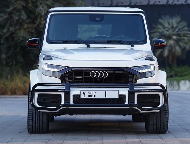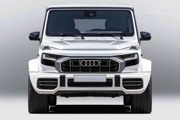 This is how a G-class with an Audi front design may look. In light of the vehicle's general practical style, the Audi design appears a little too futuristic. The headlights are well-integrated into the fascia, whereas the grille has to be replaced with something with a Q in it.
